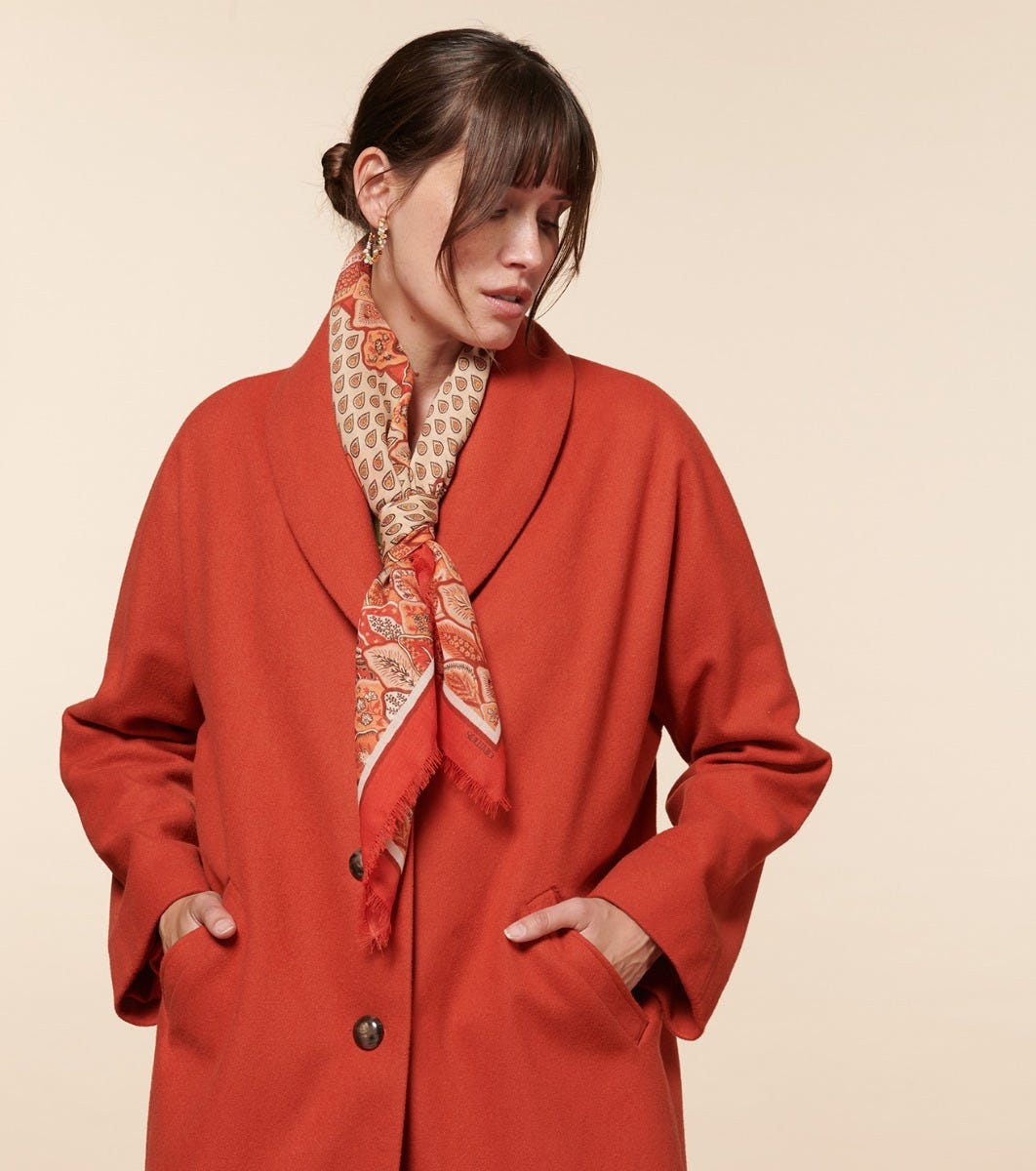 - Wool and silk square. Its vaporous, airy fabric will keep you warm while remaining light to wear.