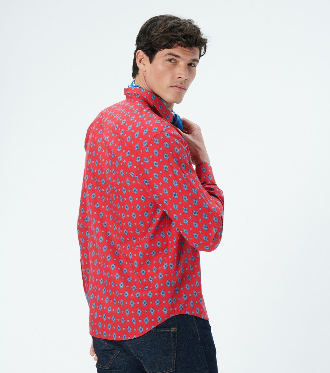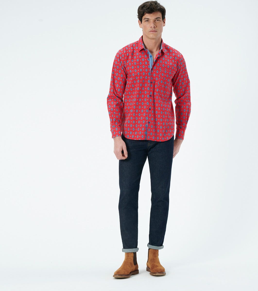 - Opposition under throat, inside collar stand and inside cuff in chambray.