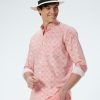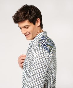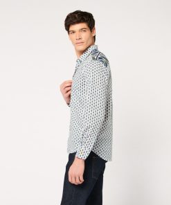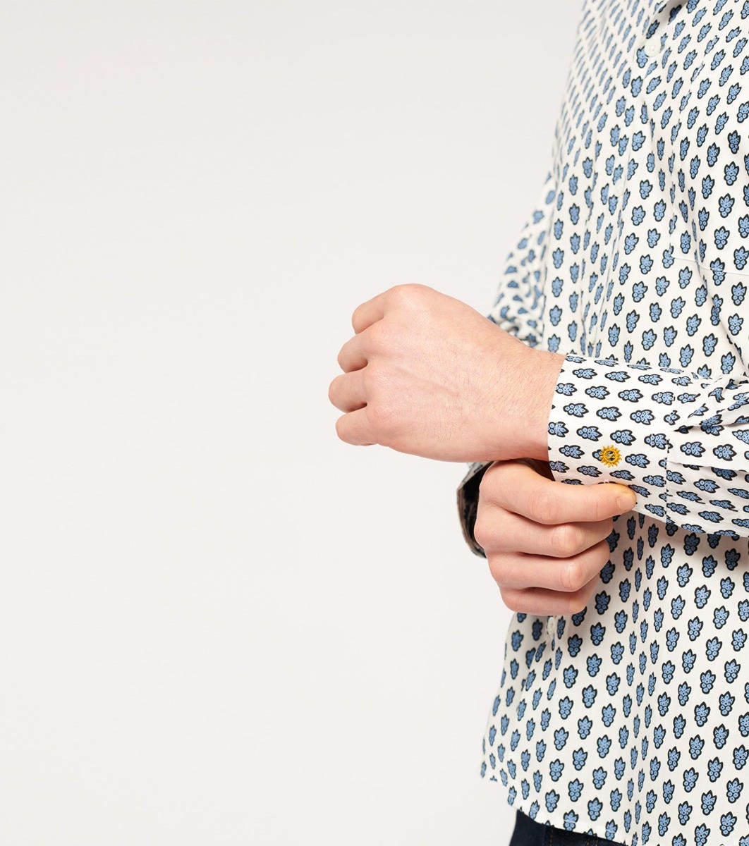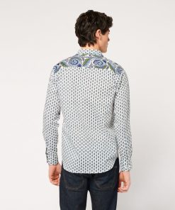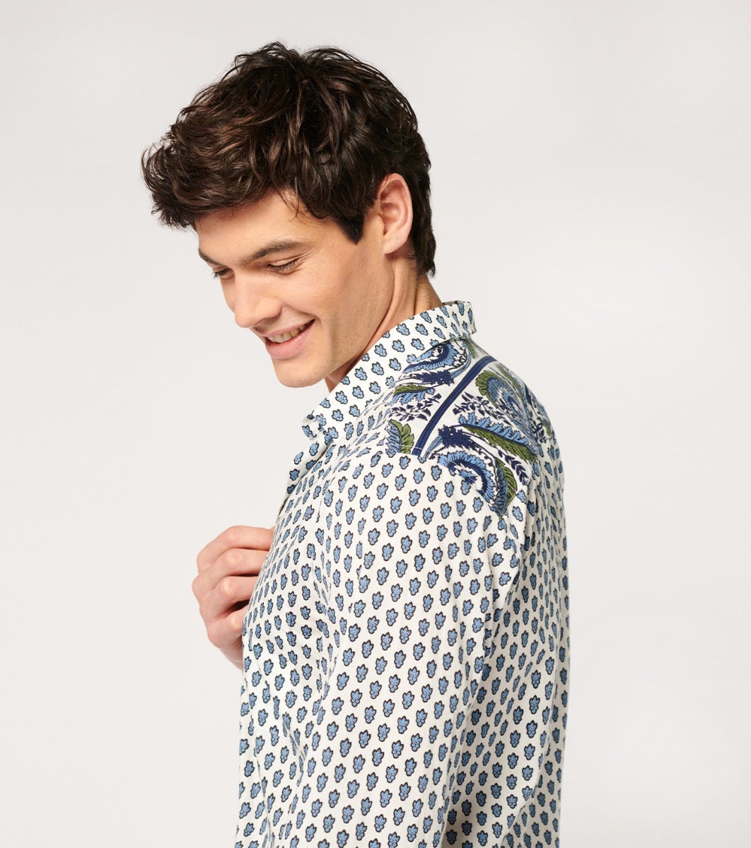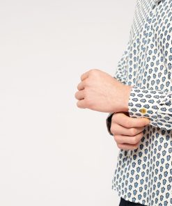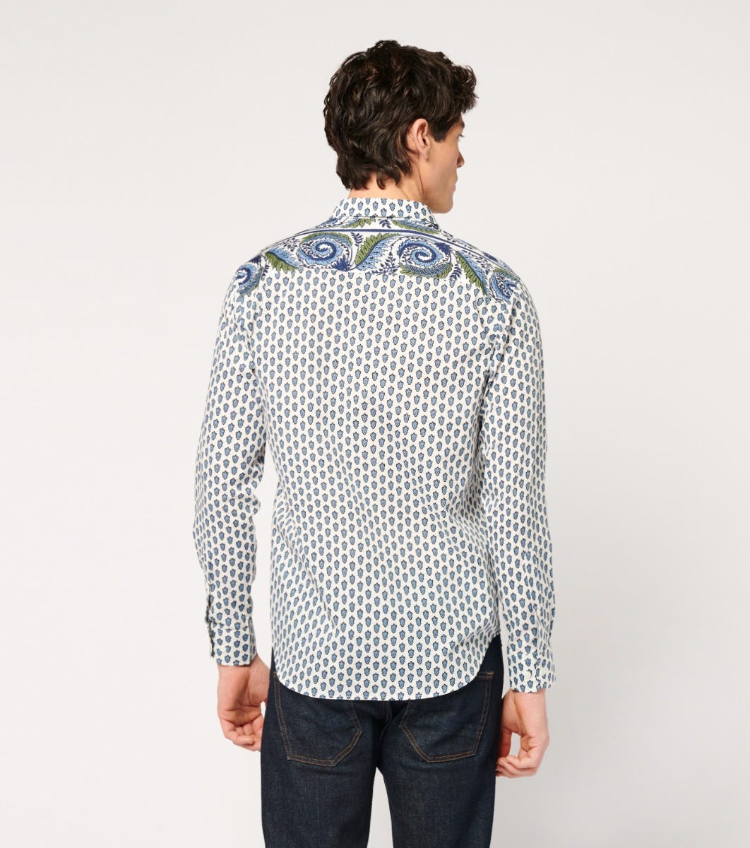 - Détaile de frise imprimé “Spirale” sur l’empiècement dos, poche poitrine, en opposition intérieure au pied de col, patte de boutonnage et à