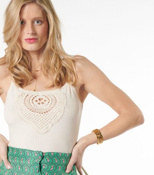 - Neckline embellished with a delicately crocheted bib featuring our iconic “Fleur d’Arles” pattern