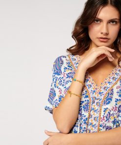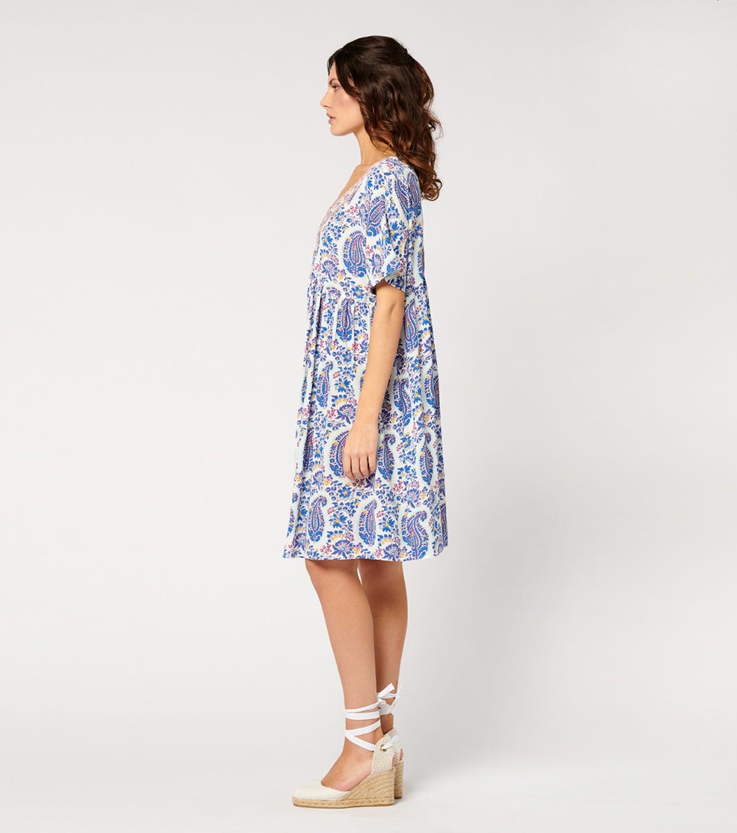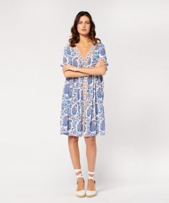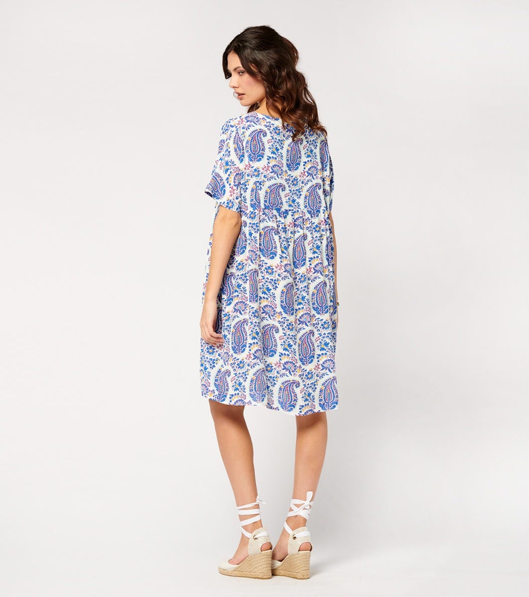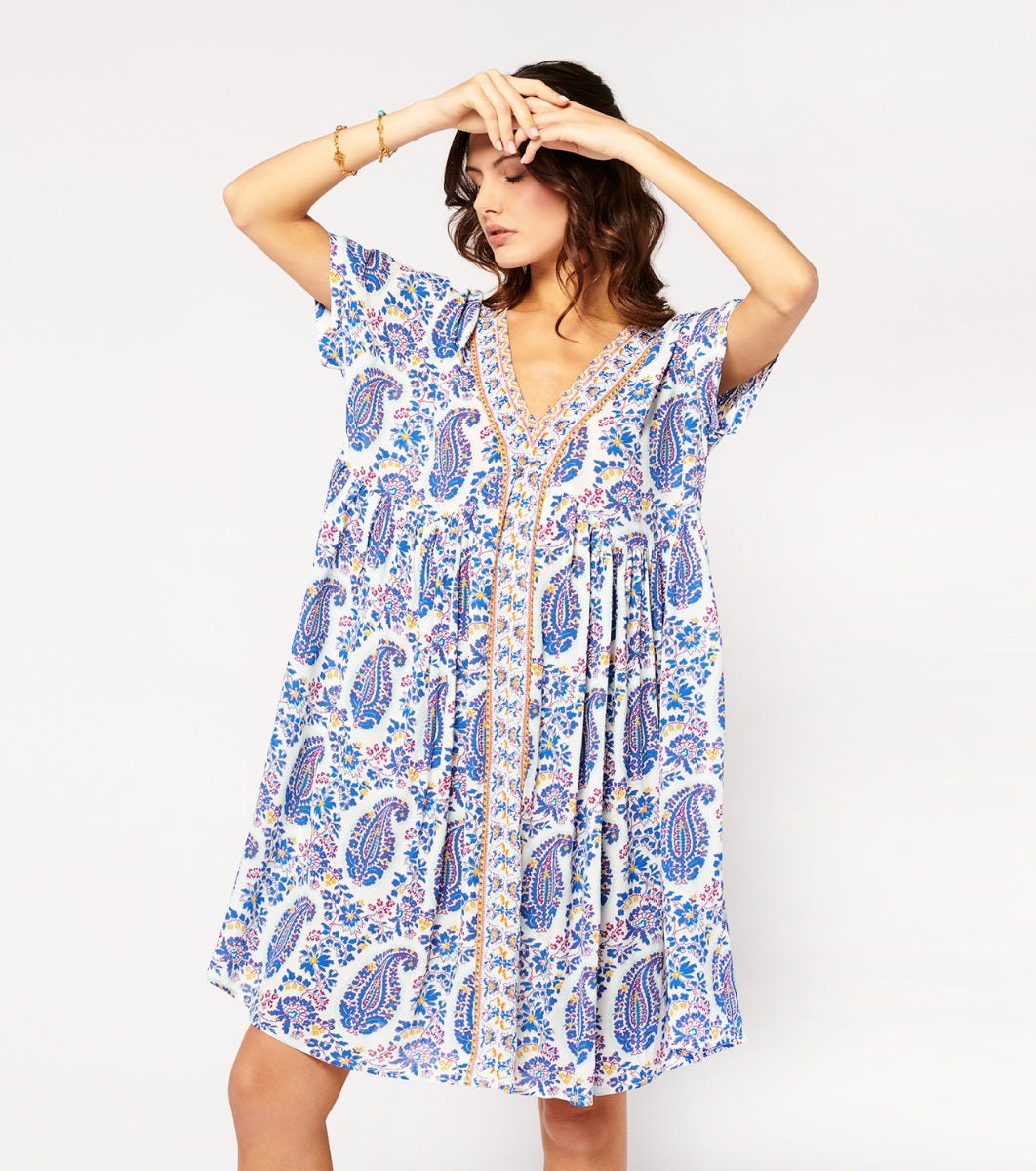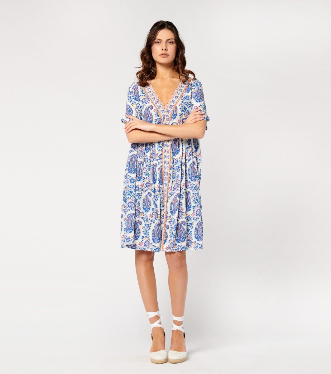 - In the spirit of bohemian chic, the Gaia dress, with its light, loose-fitting couple, is one of the house’s must-haves. In viscose crepe, this flowing piece is sublimated here by a printed braid inlaid on the middle front, adding a colorful and unique touch to this piece.