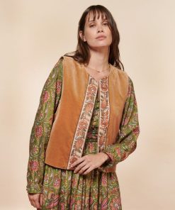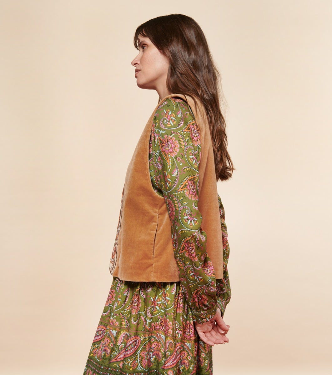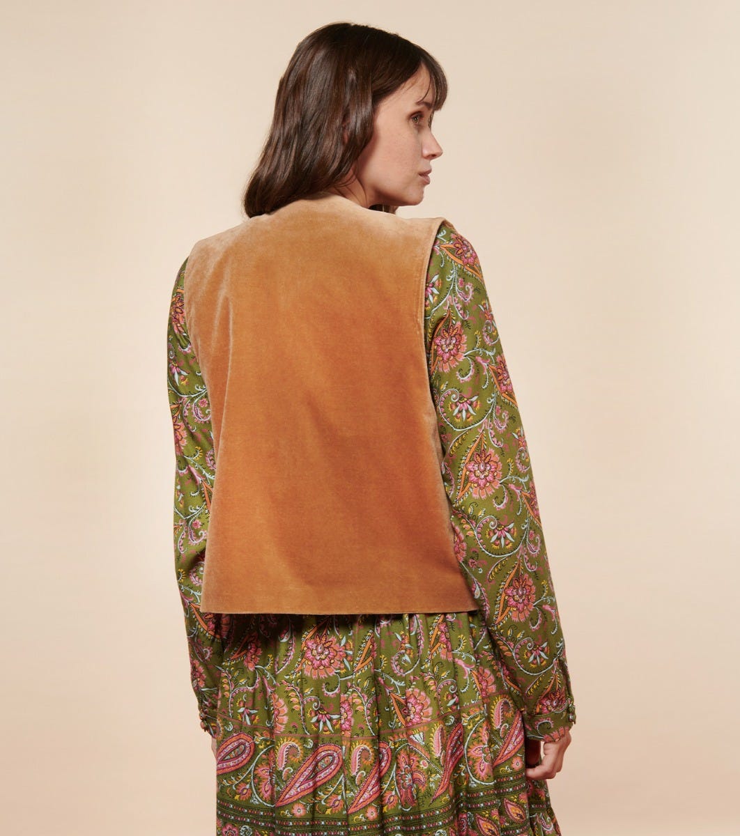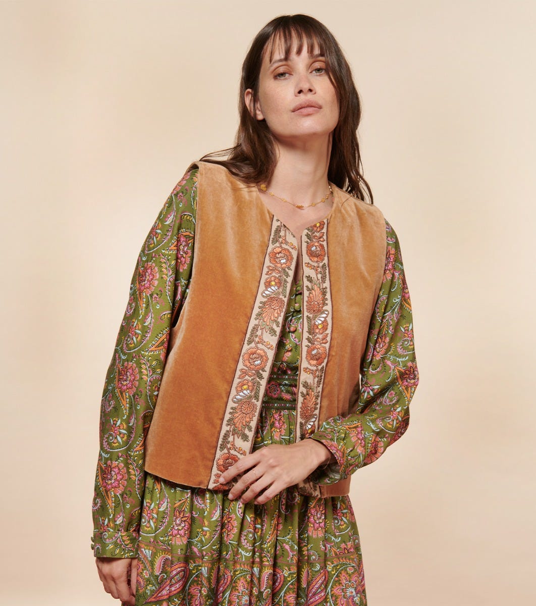 - This sleeveless vest in smooth velvet is edged with a beautiful frieze inspired by Arlesian ribbons, embroidered with our “Le Petit Artichaut” motif. It’s the perfect complement to your outfits for a bohemian touch, and its printed lining adds a touch of originality.