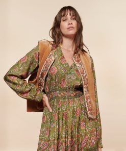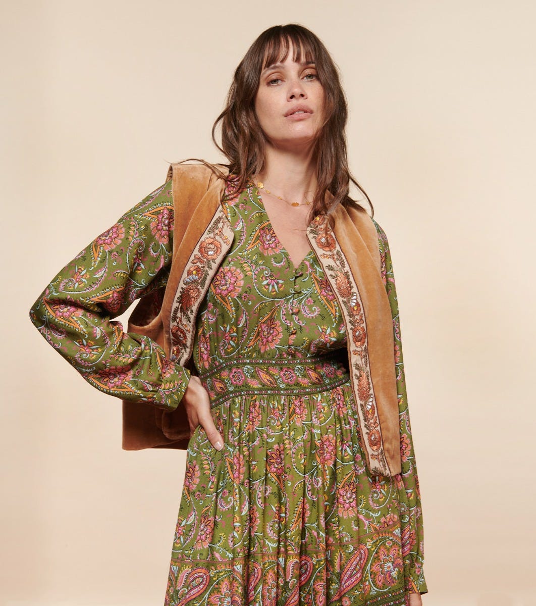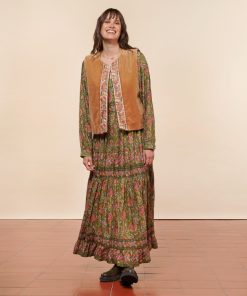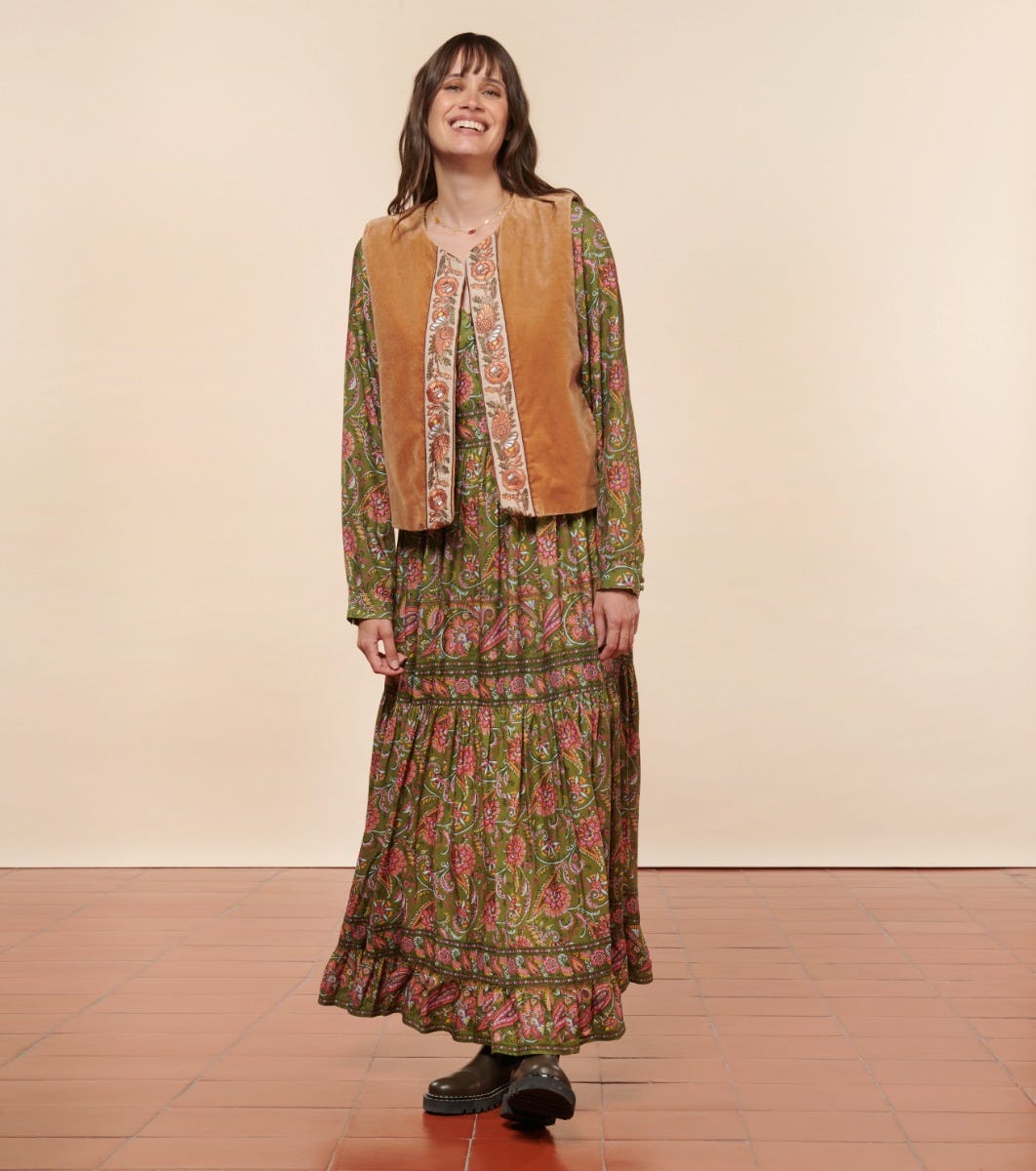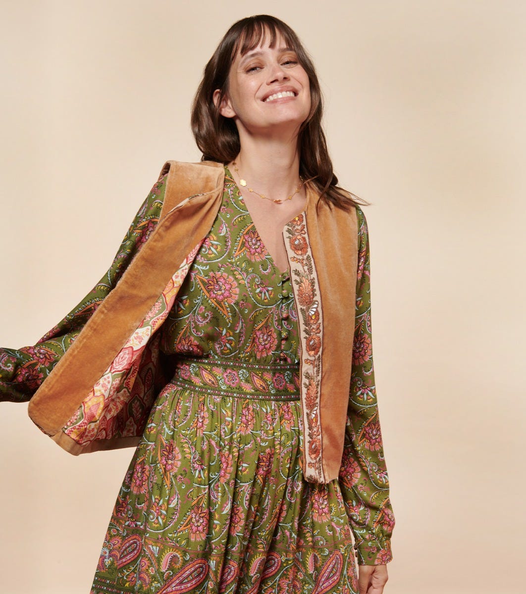 - This sleeveless vest in smooth velvet is edged with a beautiful frieze inspired by Arlesian ribbons, embroidered with our “Le Petit Artichaut” motif. It’s the perfect complement to your outfits for a bohemian touch, and its printed lining adds a touch of originality.