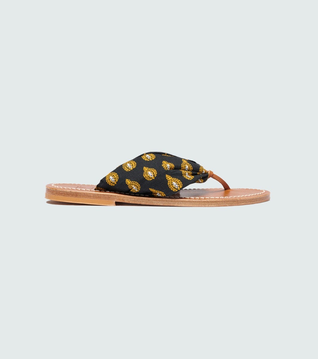 - Elegant and comfortable, the Sabayon model in collaboration with K.Jacques features an instep strap in Souleiado printed fabric, with a leather loop at the front to ensure good foot support.