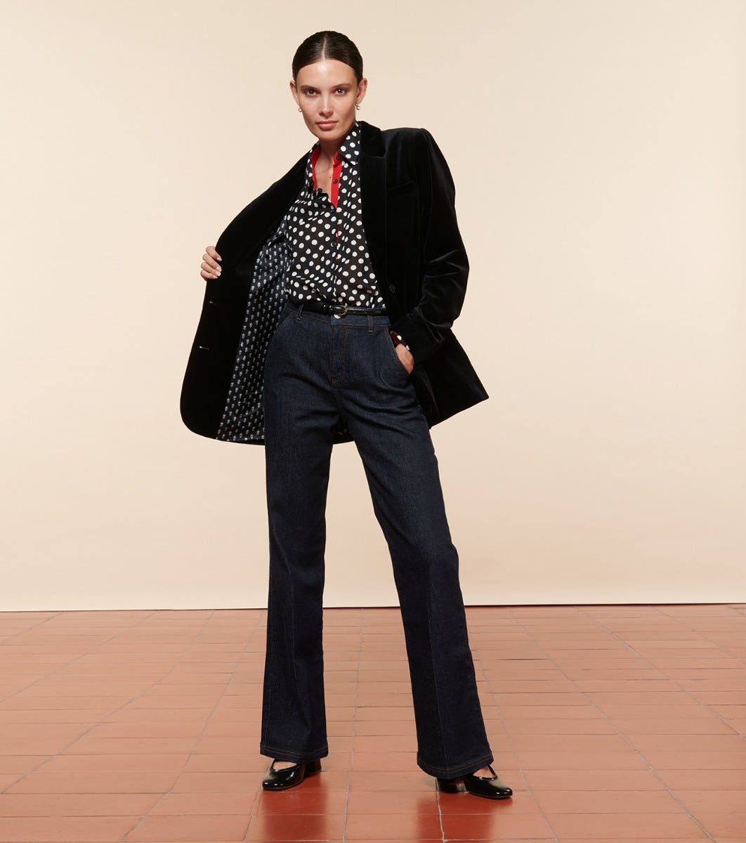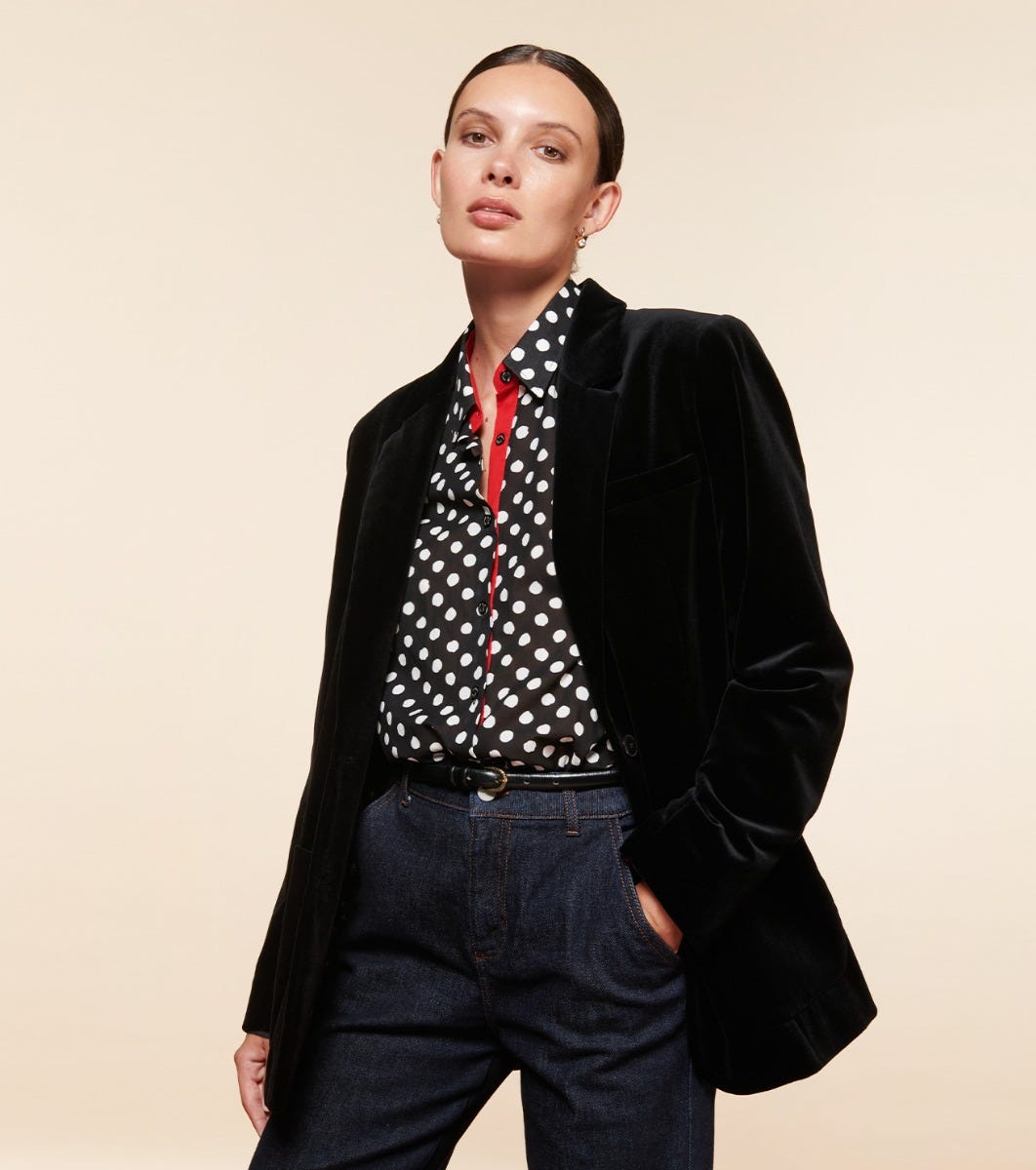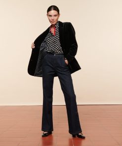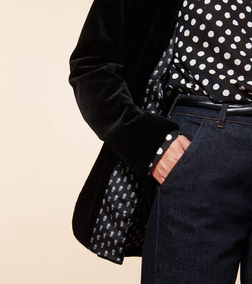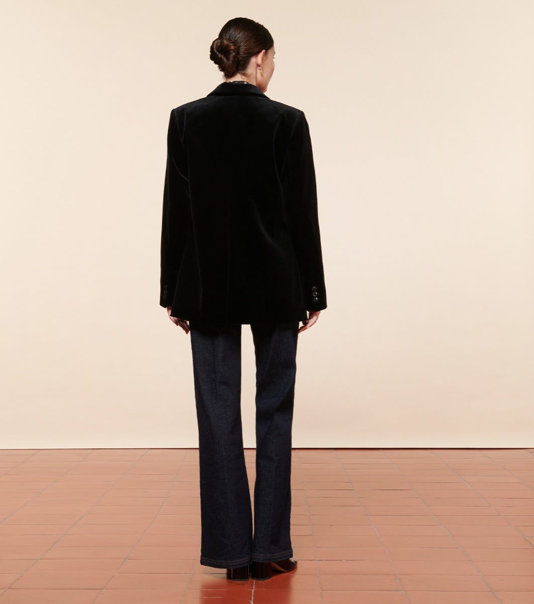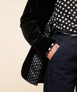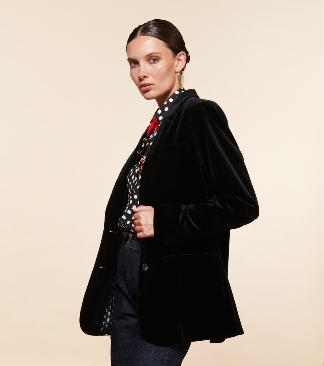 - Augusta is a suit jacket inspired by the men’s wardrobe. This slightly oversized straight-cut blazer features structured shoulders and flap side pockets. Its smooth velvet details and fabric lend it elegance and femininity.