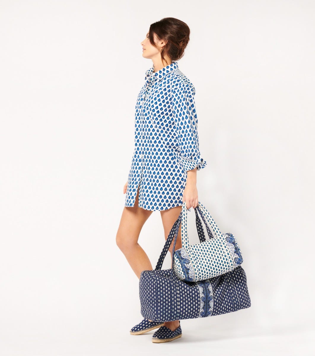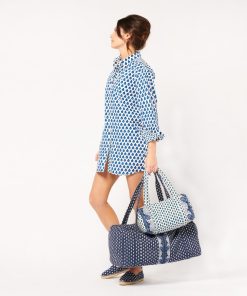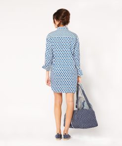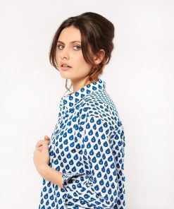 - En batiste de coton imprimé en jeu de patch avec nos motifs iconiques “La Mouche” et “Indiana” coloris blanc bleu