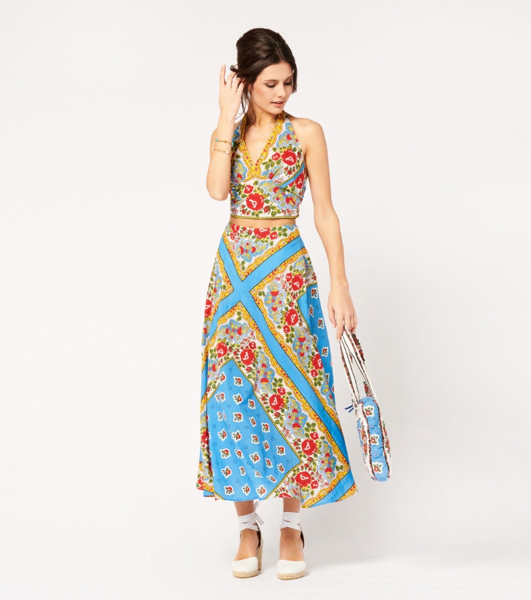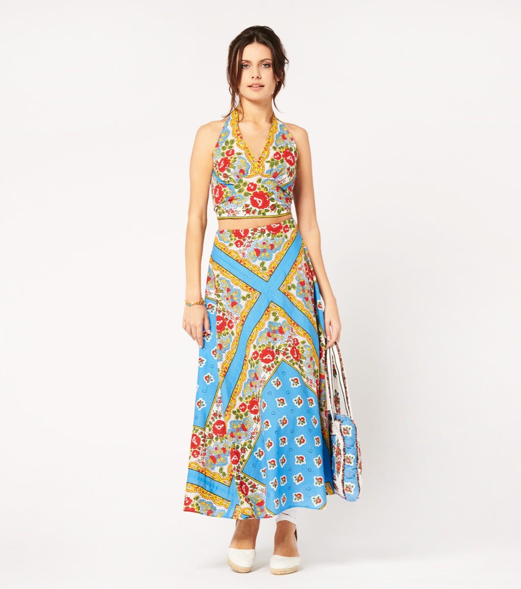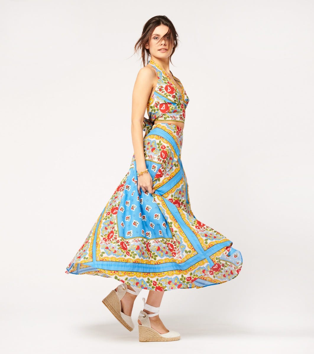 - Inspirée des archives Souleiado, cette jupe en batiste de coton imprimé allie tradition et modernité, avec une coupe ajustée et son bas légèrement évasé. Sa spécificité est faite par l’assemblage de foulards qui viennent donner sa forme à la jupe.