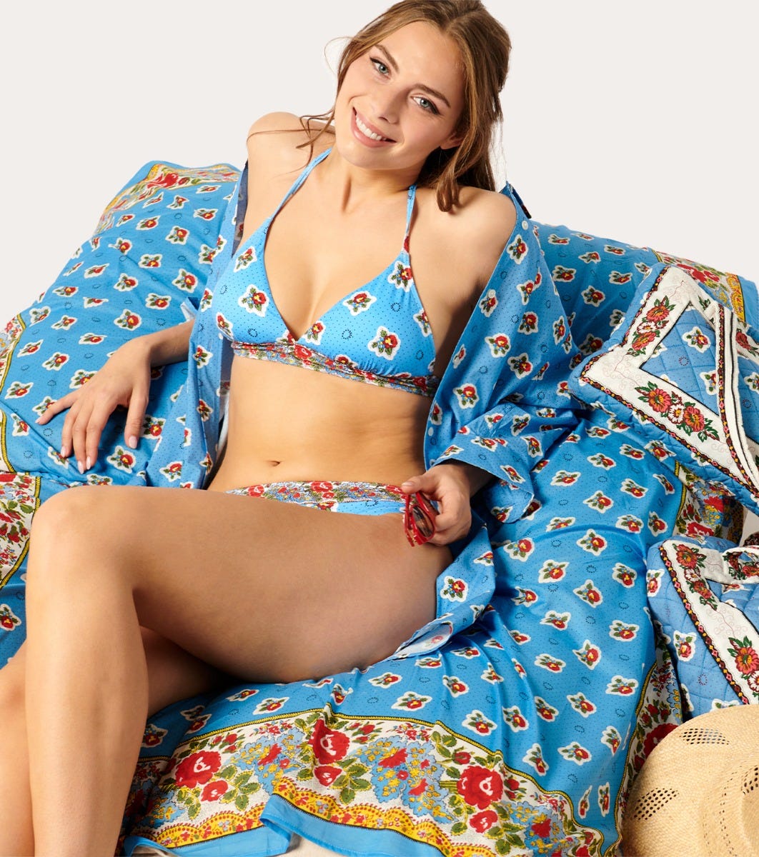 - Sublimate your bosom with our Samena triangle, highlighted by its fine printed frieze. Tied at the neck and with its clip fastening at the back, you’ll be able to adjust it perfectly!