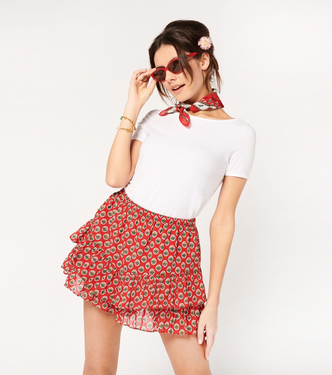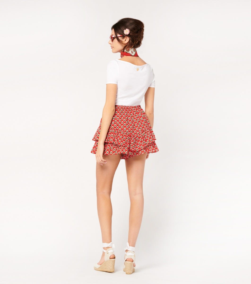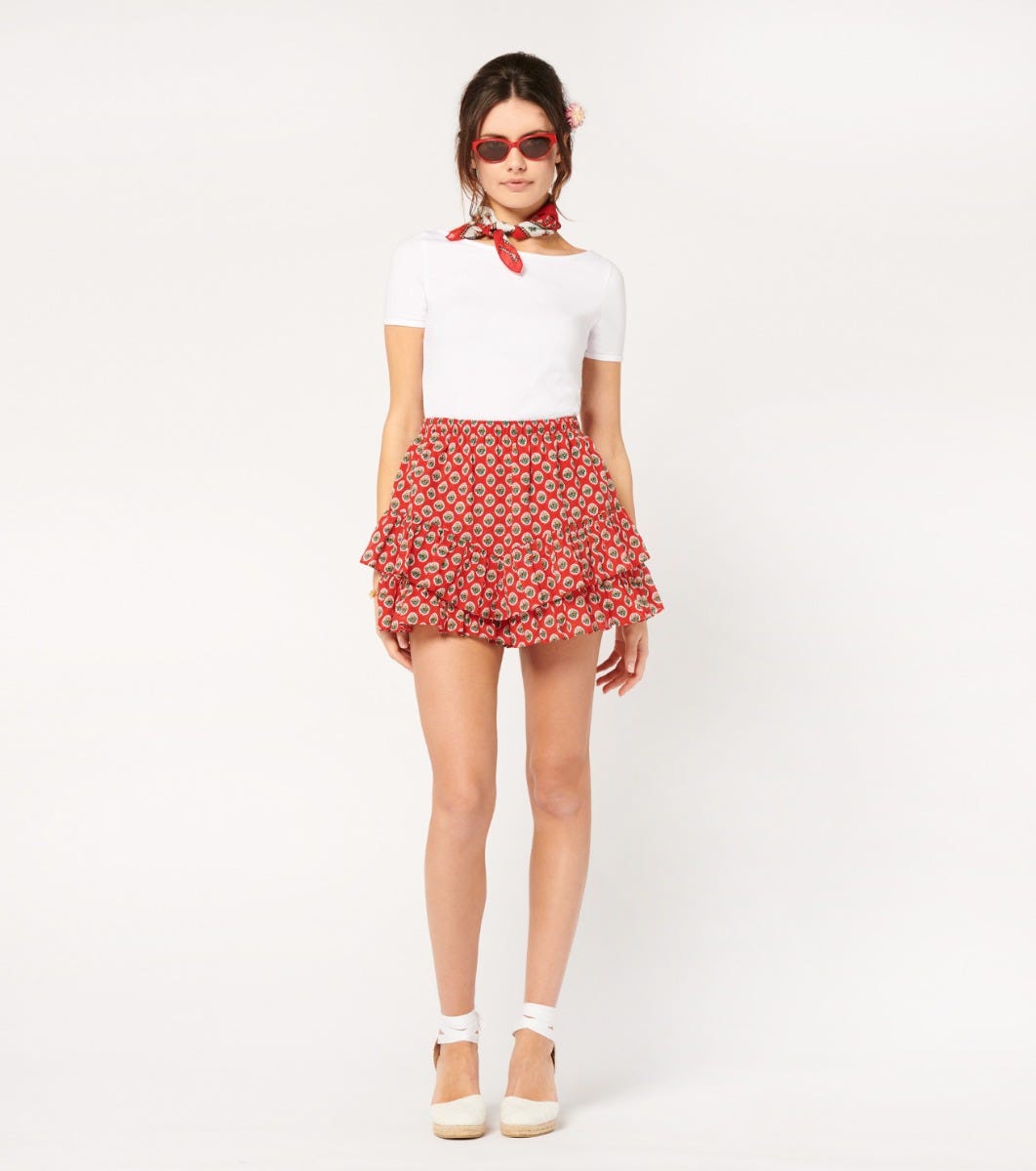 - Our Cavalaire skort combines lightness and femininity. Its elasticated waistband with gathers ensures optimum comfort, while the wide ruffle at the bottom adds movement. Lined in cotton voile, it’s perfect for a fresh, modern look.