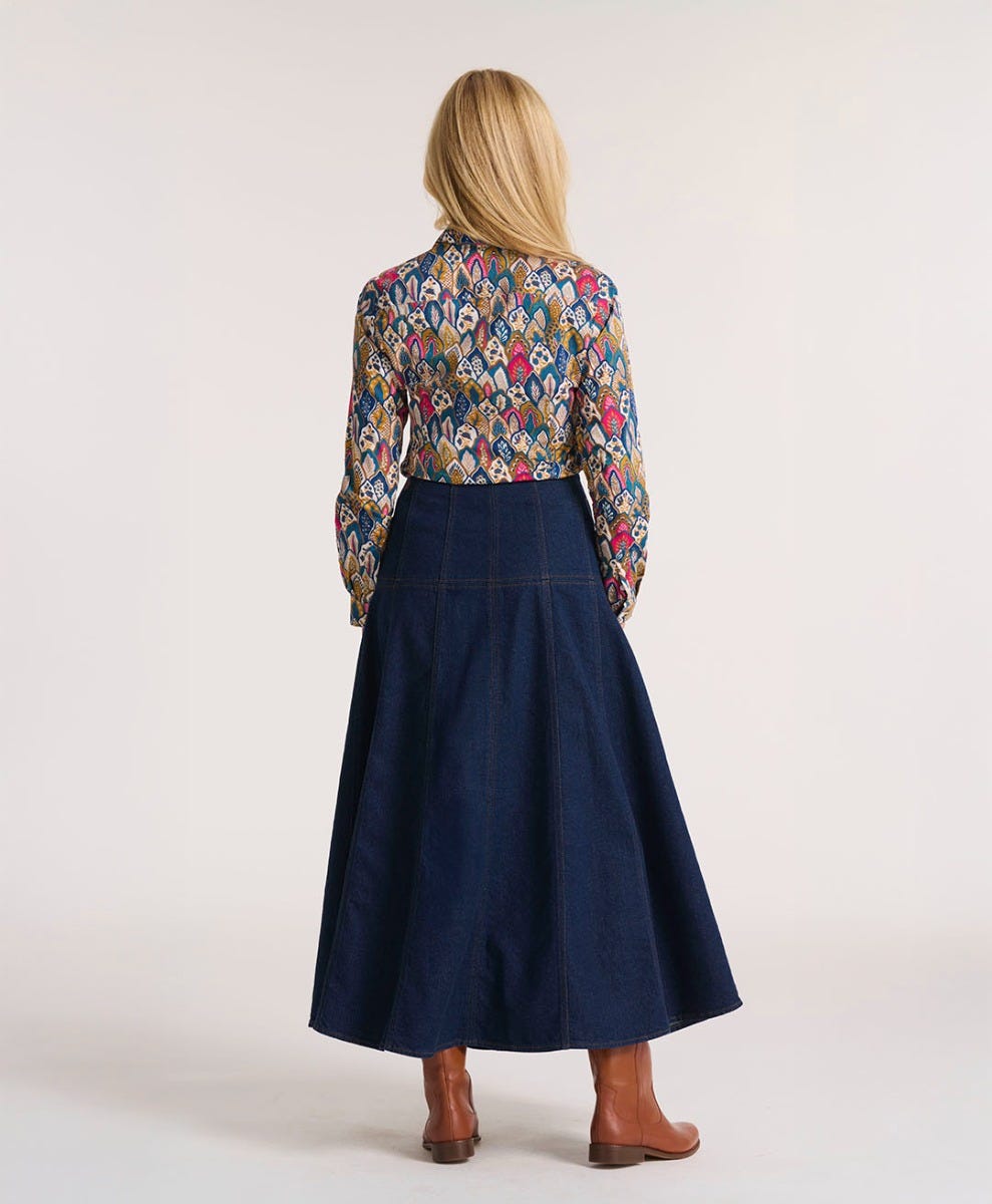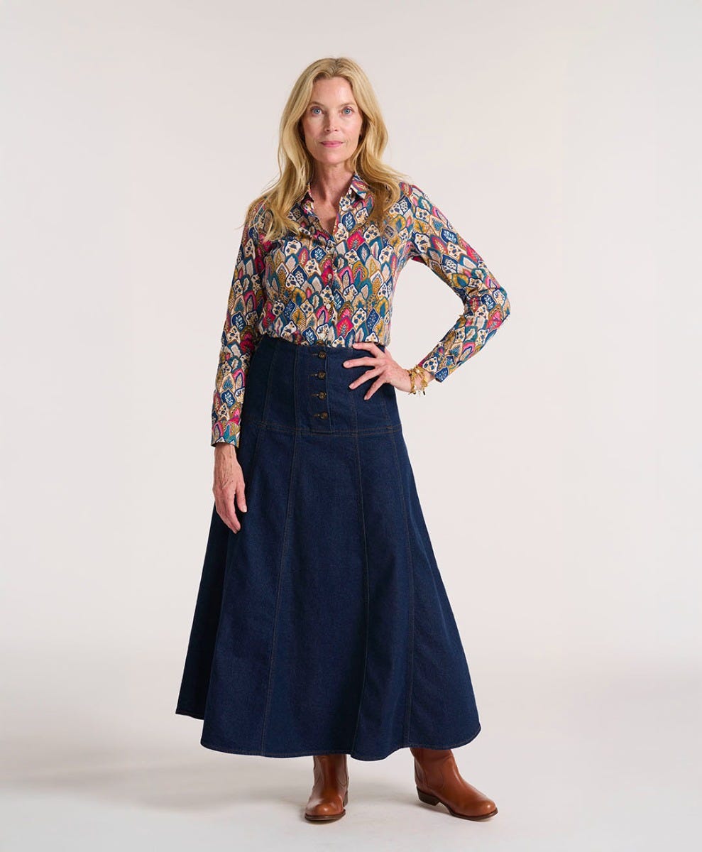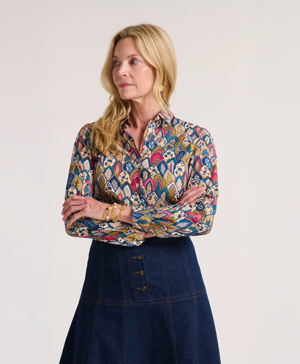 - Elina, our feminine shirt with a slim fit that delicately hugs the figure, enhanced by chest darts and subtle back cinching.