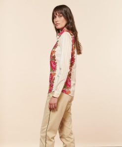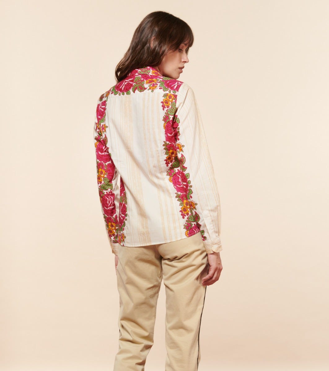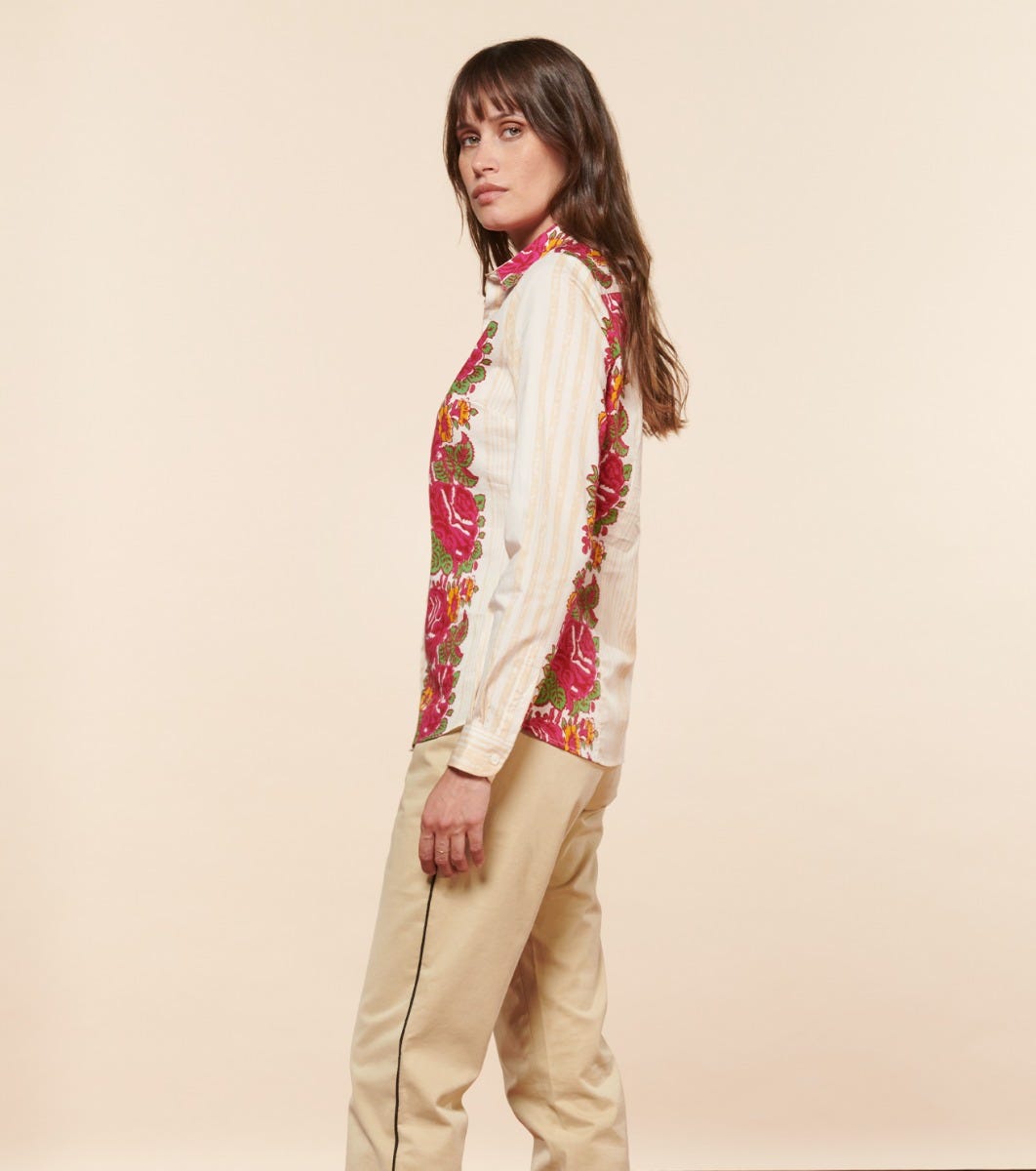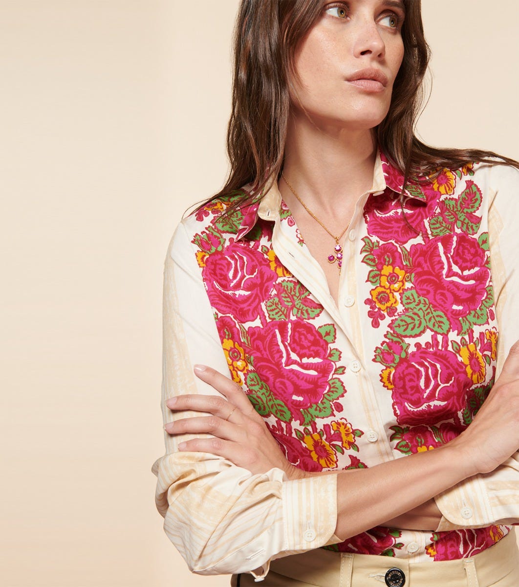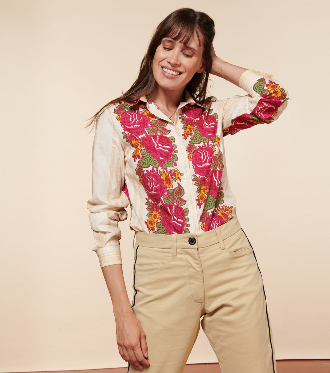- 100% cotton poplin, printed with our “Chantal” motif in ecru fuchsia