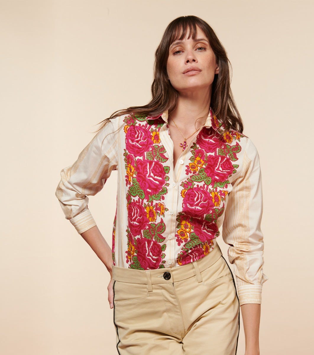 - Elina, our feminine shirt with a slim fit: close to the body and slightly fitted thanks to a set of chest darts and back darts.