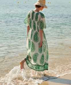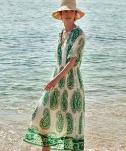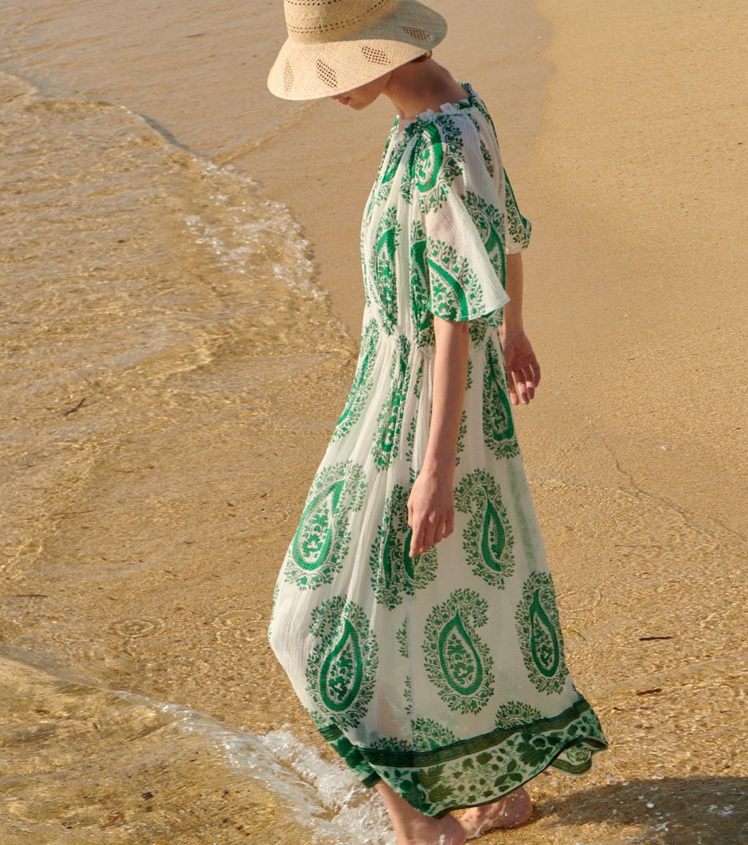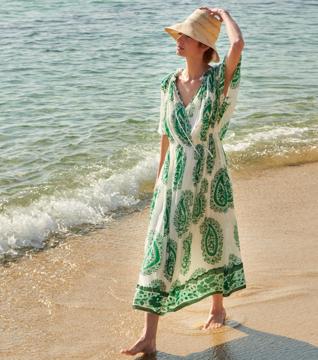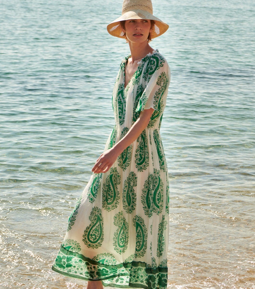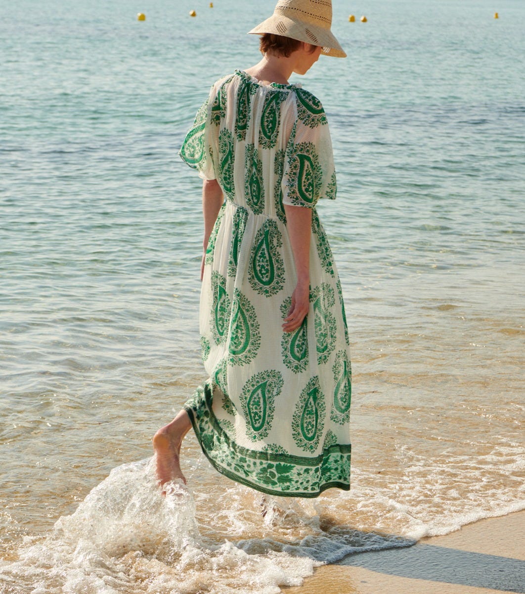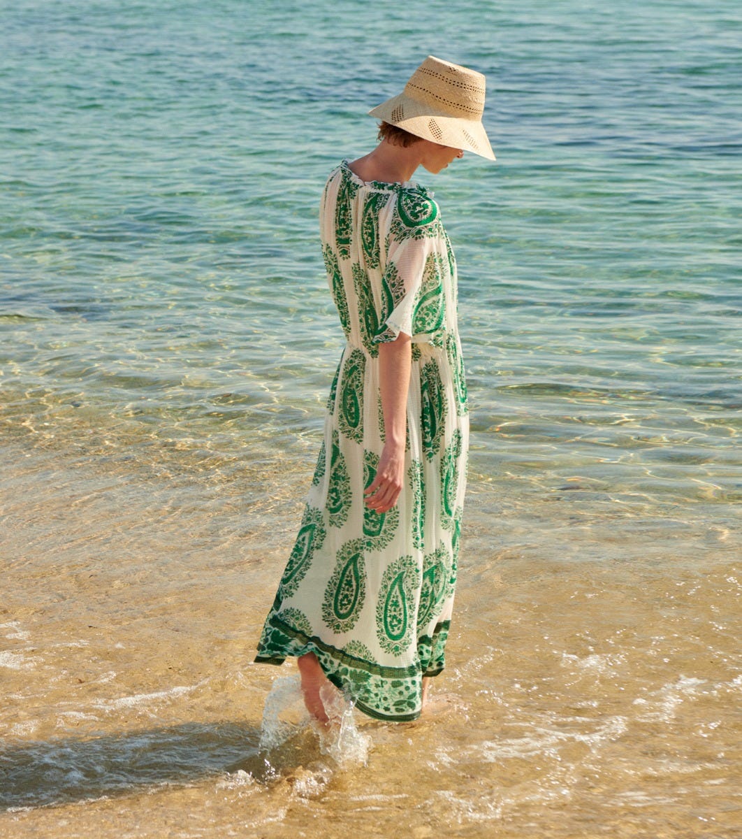 - Printed frieze detail at bottom of dress in our “Green Equinox” motif