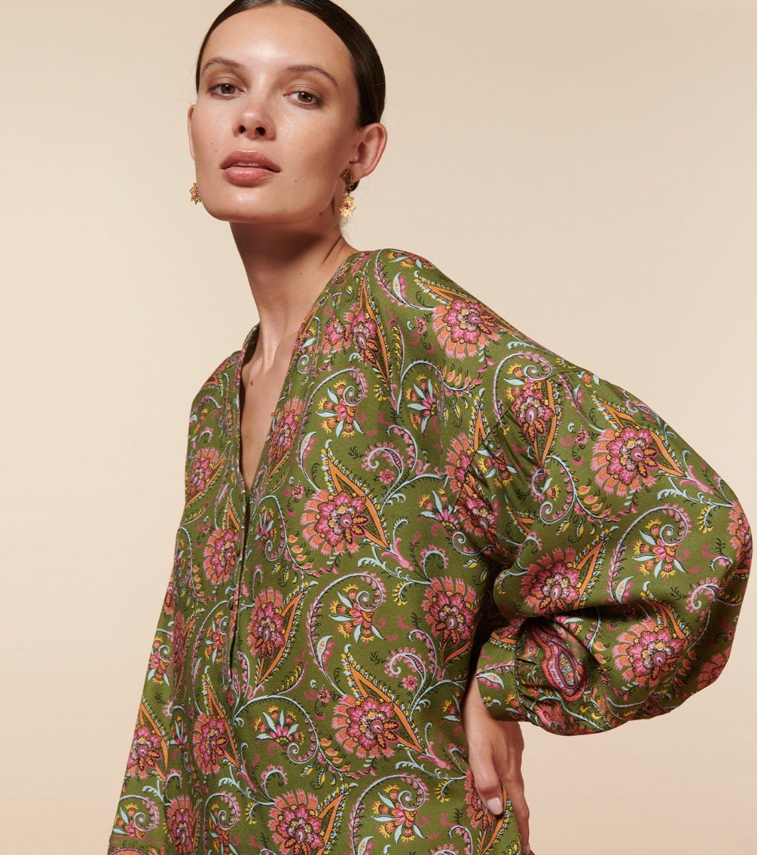 - In viscose twill printed with our “Persepolis” motif in khaki fuchsia