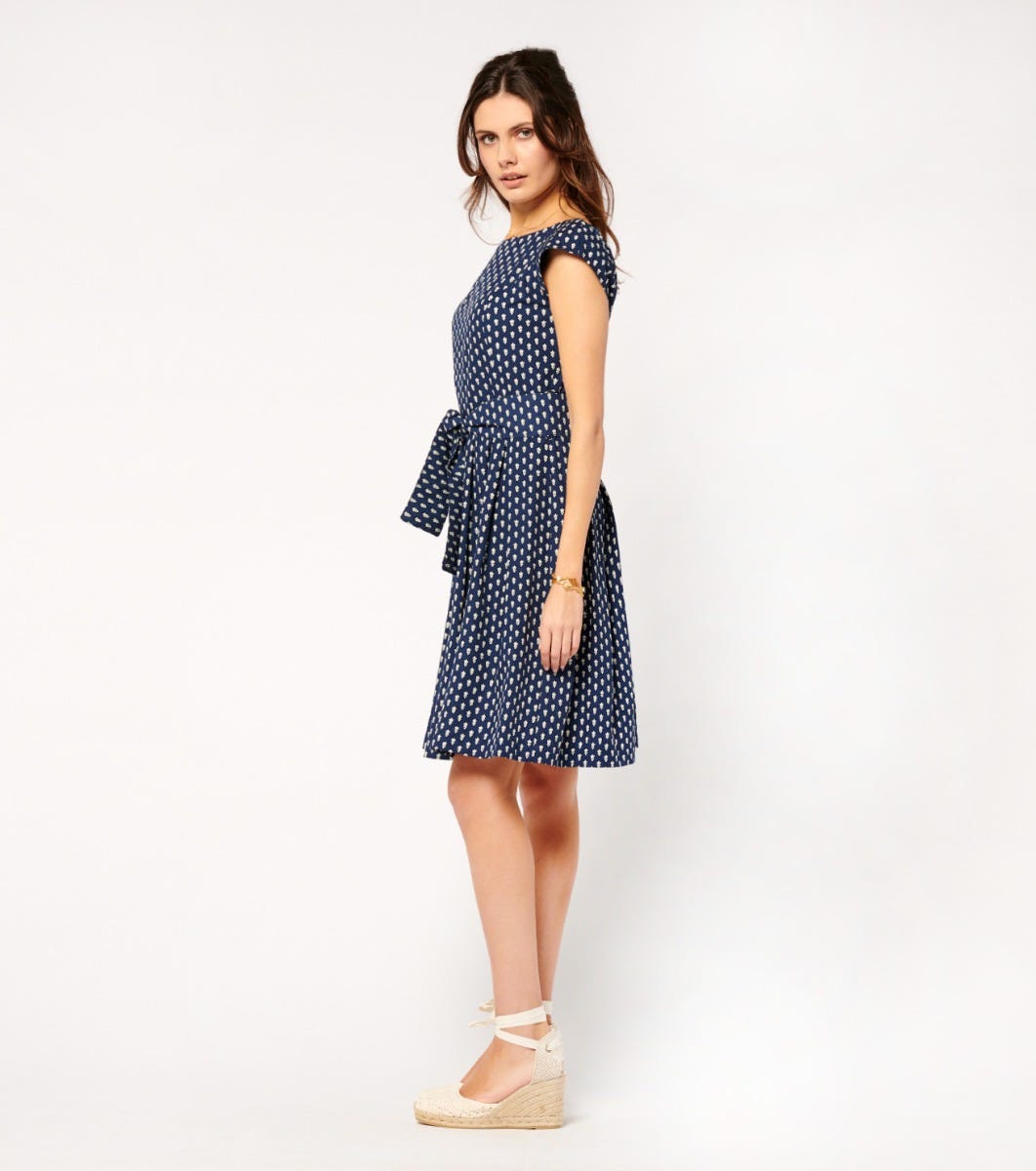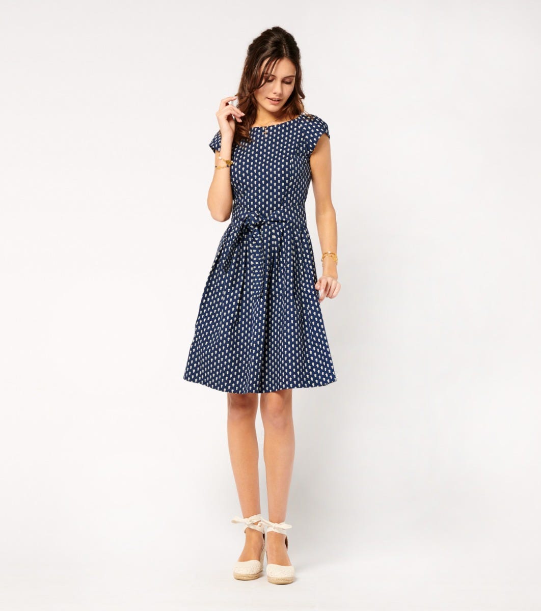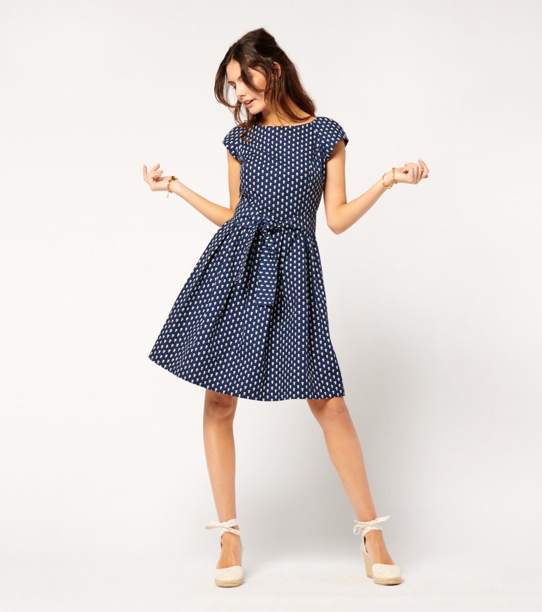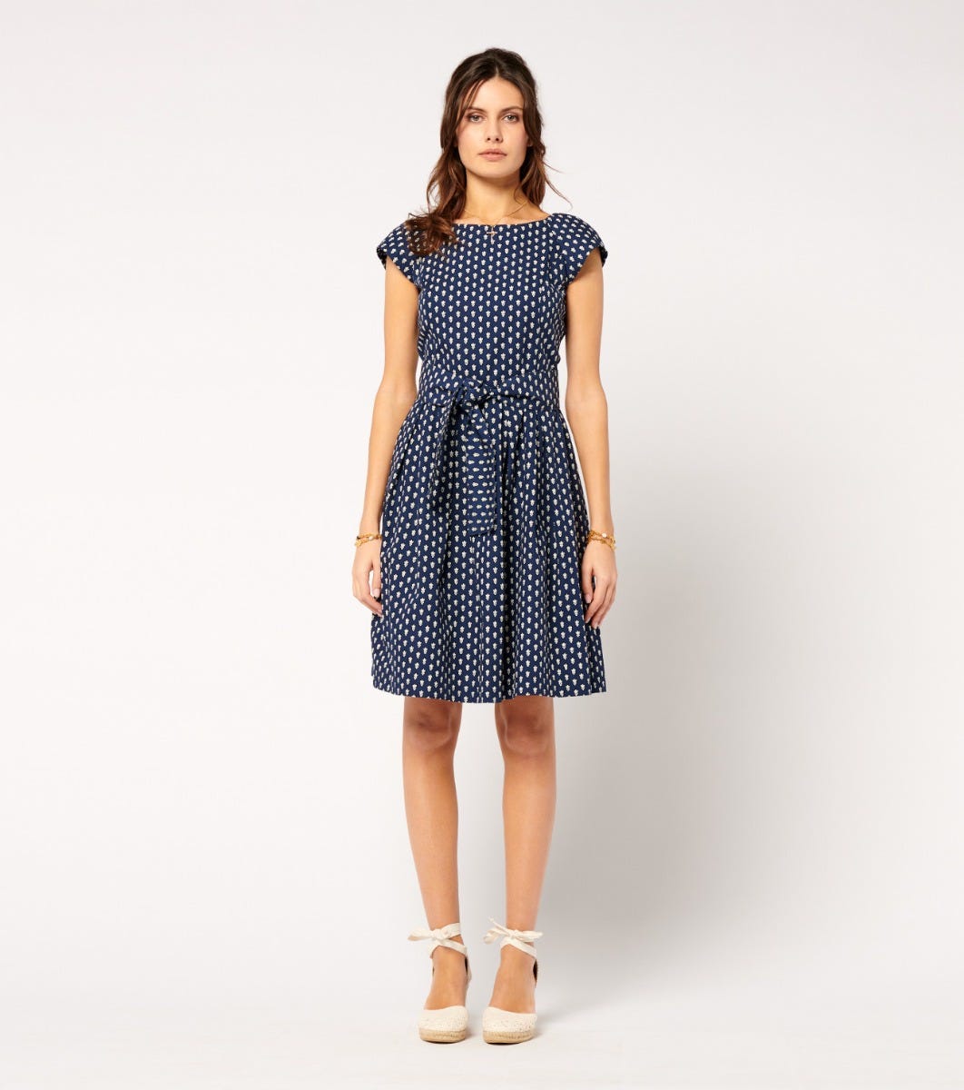 In cotton poplin printed with our iconic navy “La Mouche” motif - Fitted top and full skirt with hollow pleats at waistline