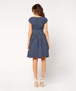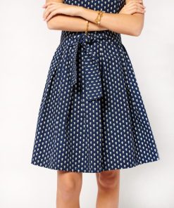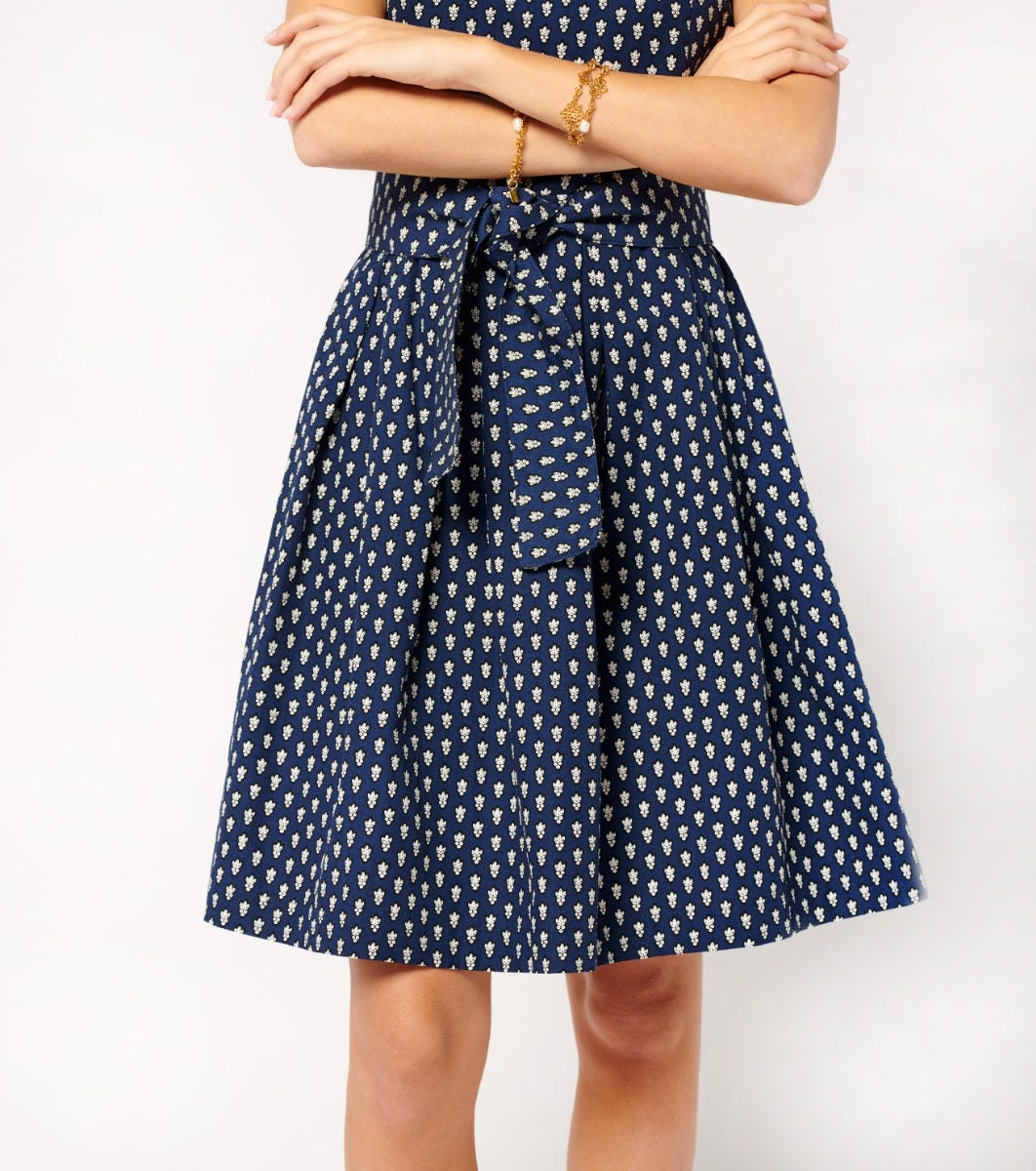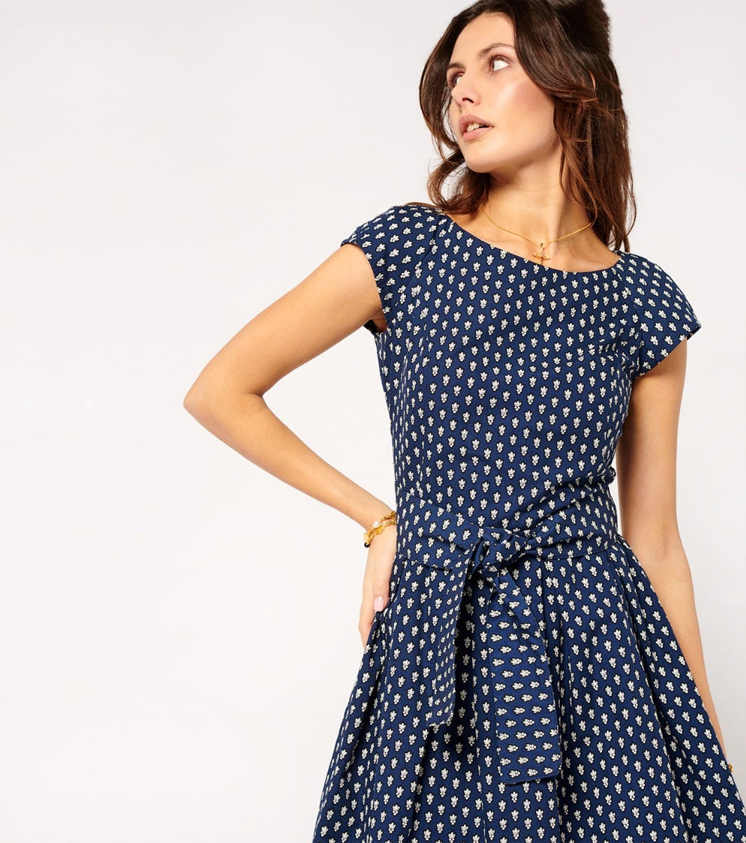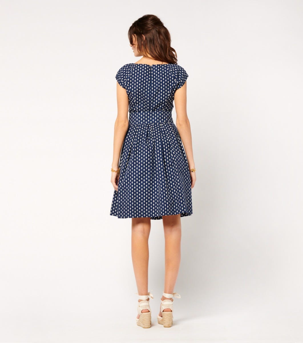 In cotton poplin printed with our iconic navy “La Mouche” motif - Fitted top and full skirt with hollow pleats at waistline