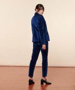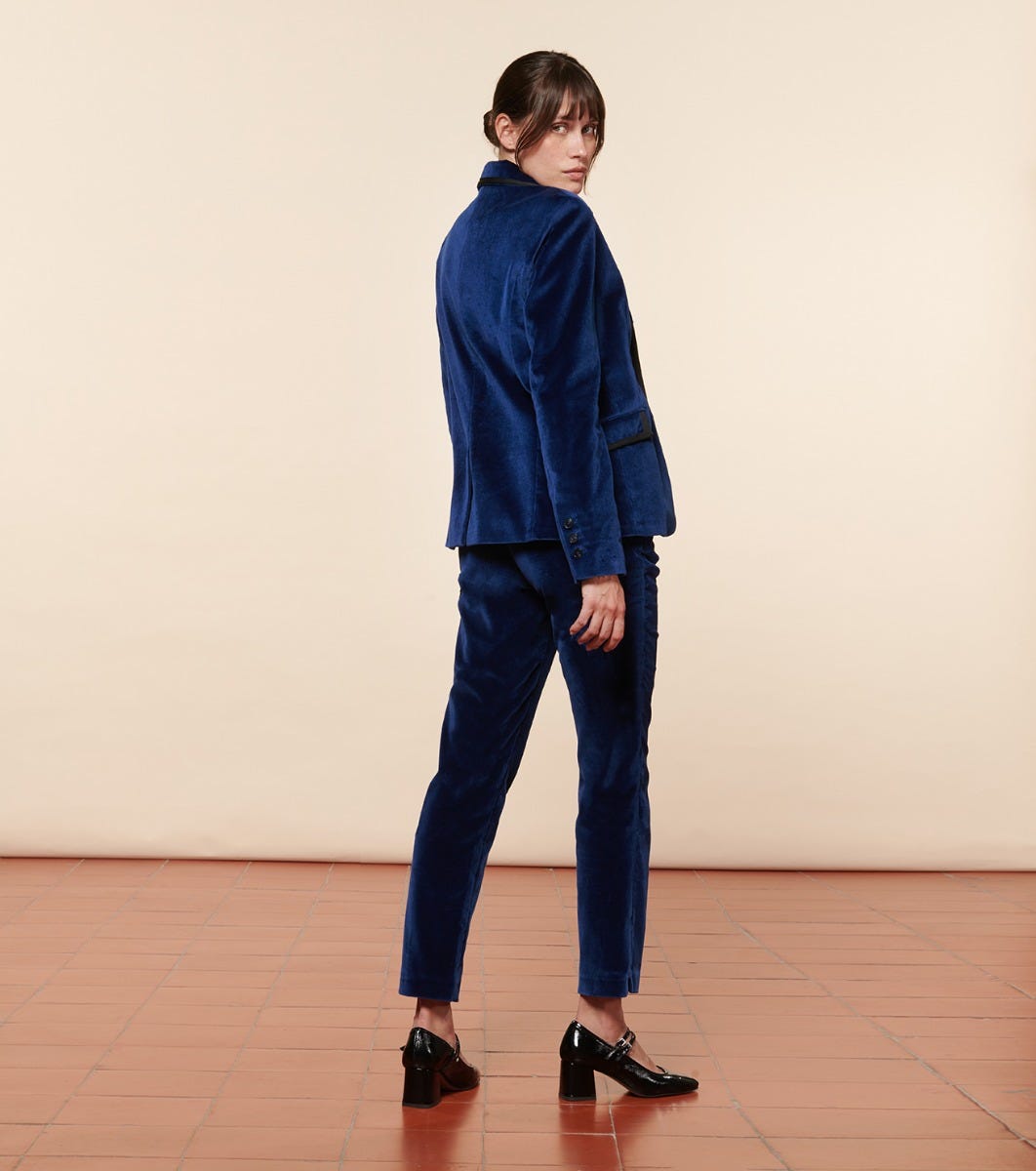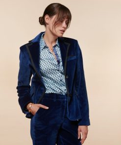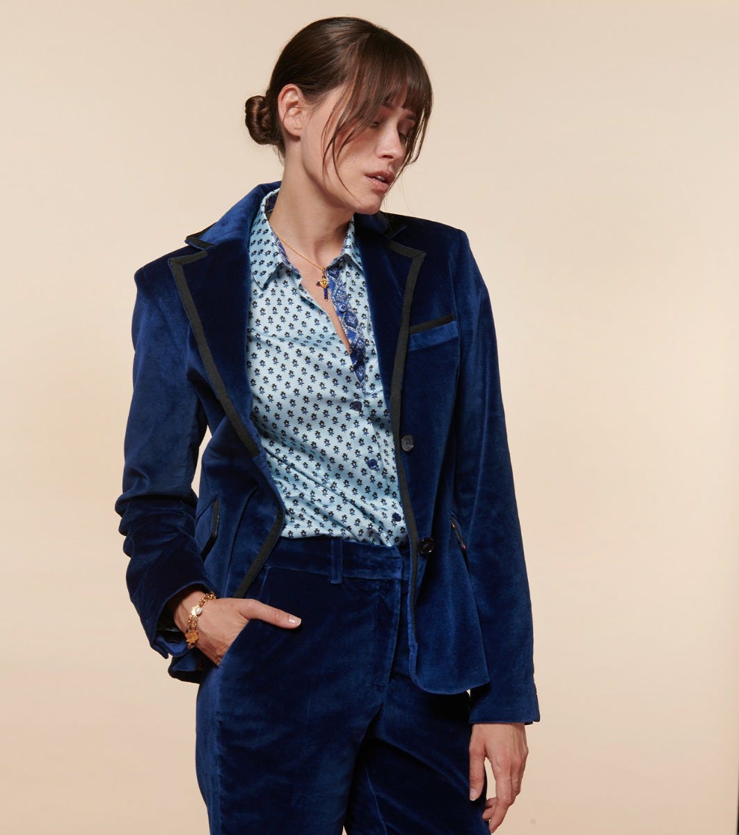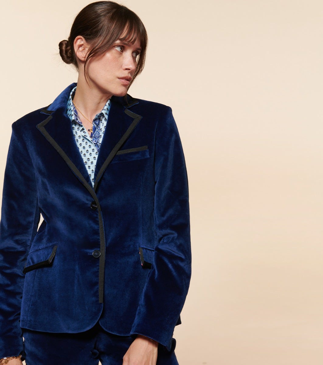 - Our iconic Chloé jacket! This timeless Chloé blazer jacket comes in smooth, slightly stretch velvet in a beautiful deep blue. Its black twill bias detail carefully lines the collar and pockets, inspired by Gardians jackets. Its asymmetrical cut emphasizes your waist and feminizes your silhouette.
