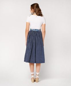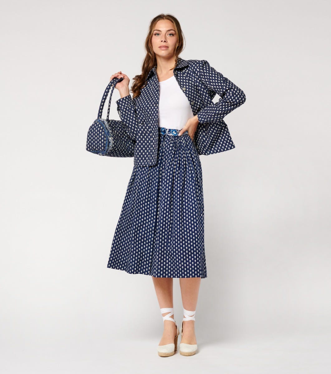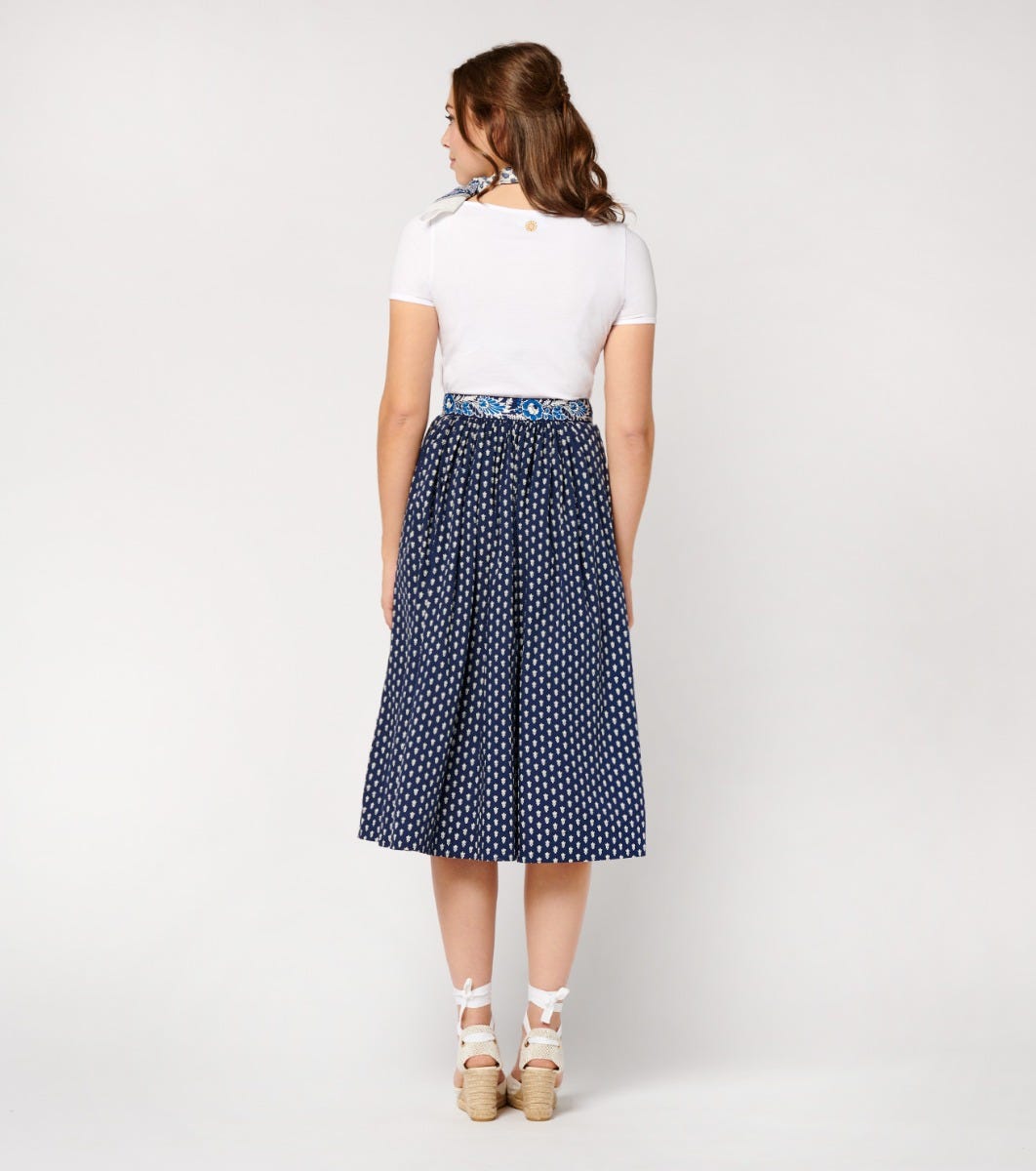 In cotton poplin printed with our inconical “La Mouche” motif in navy collar - Set of “Le Petit Artichaud” and “Artichaud” braids on underskirt, waistband and hidden button placket