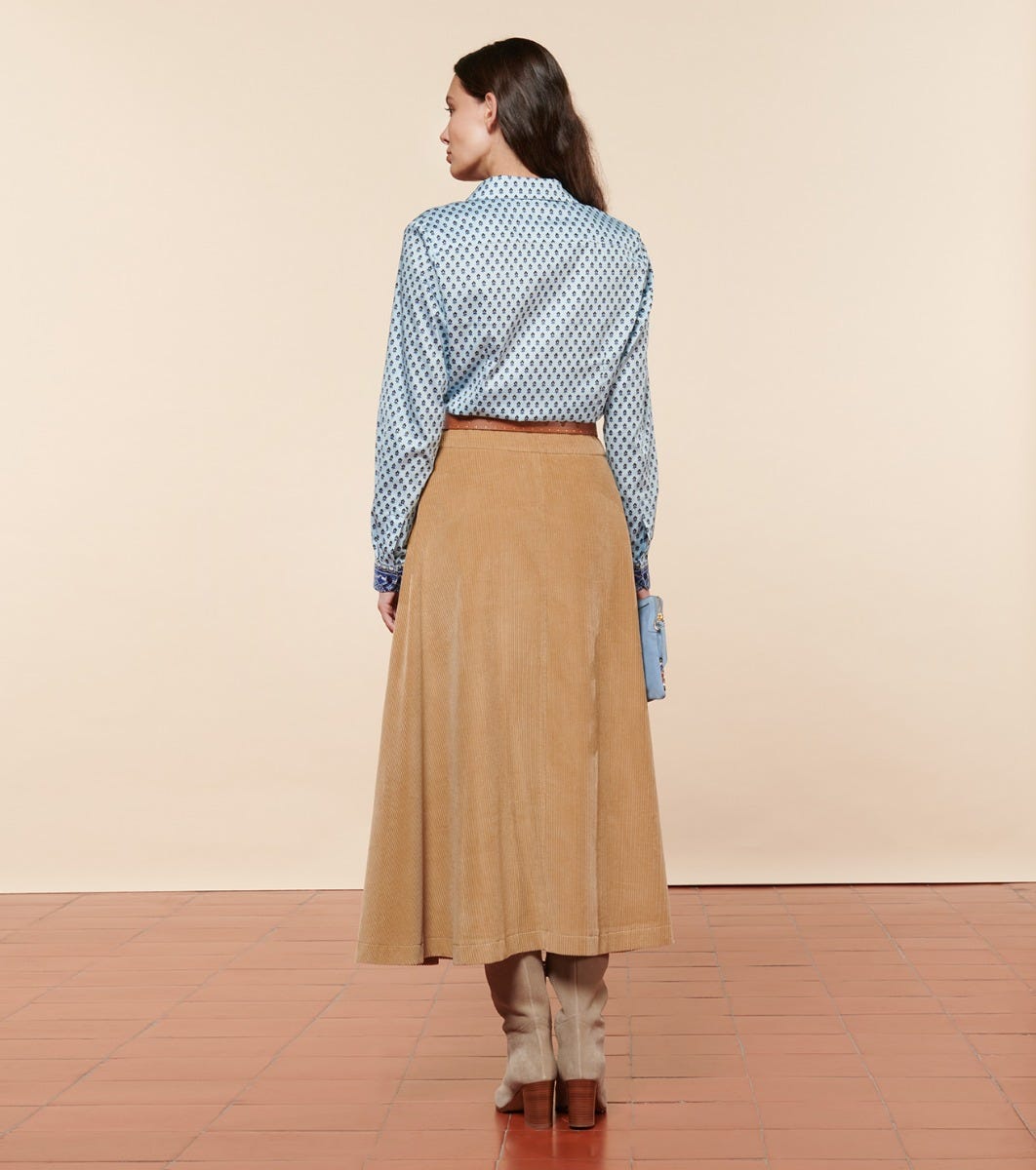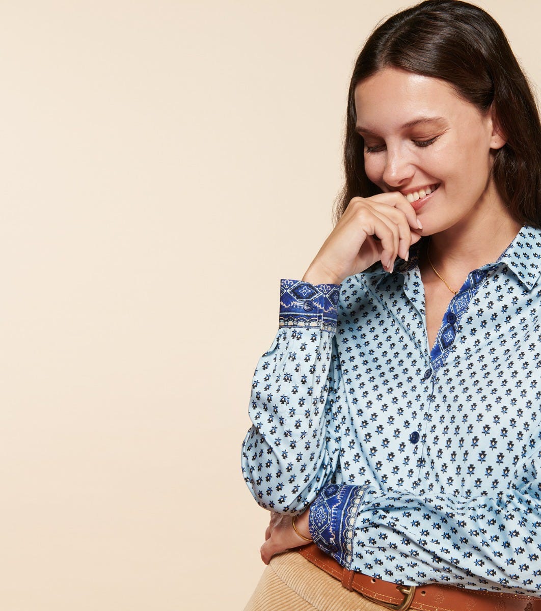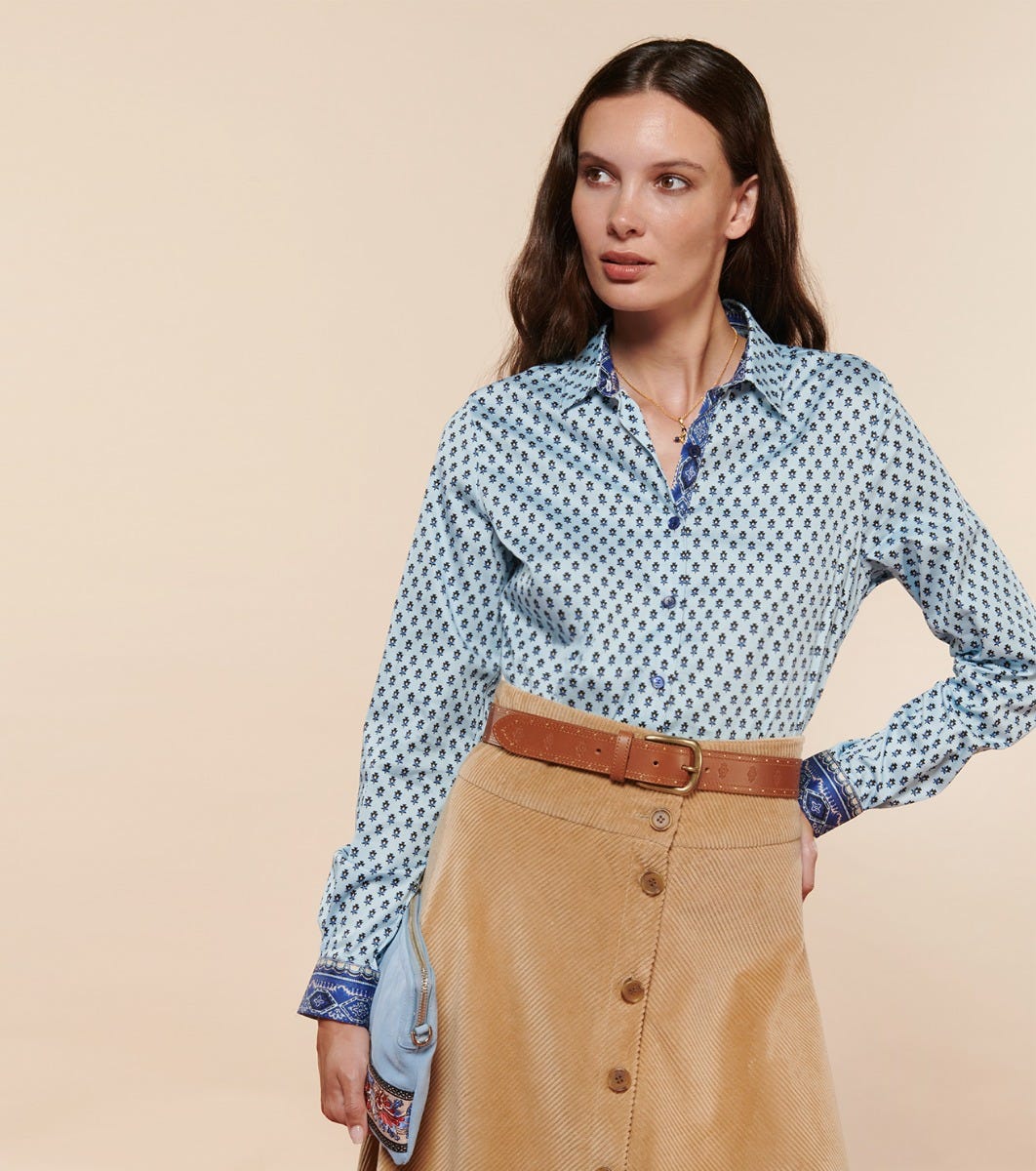 - Elina, our feminine shirt with a slim fit: close to the body and slightly fitted thanks to a set of chest darts and back darts.