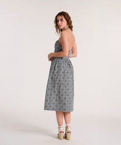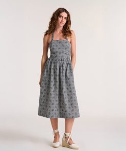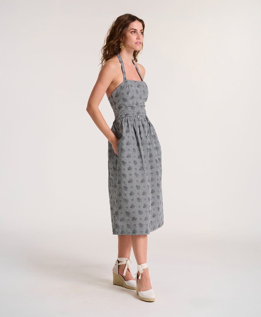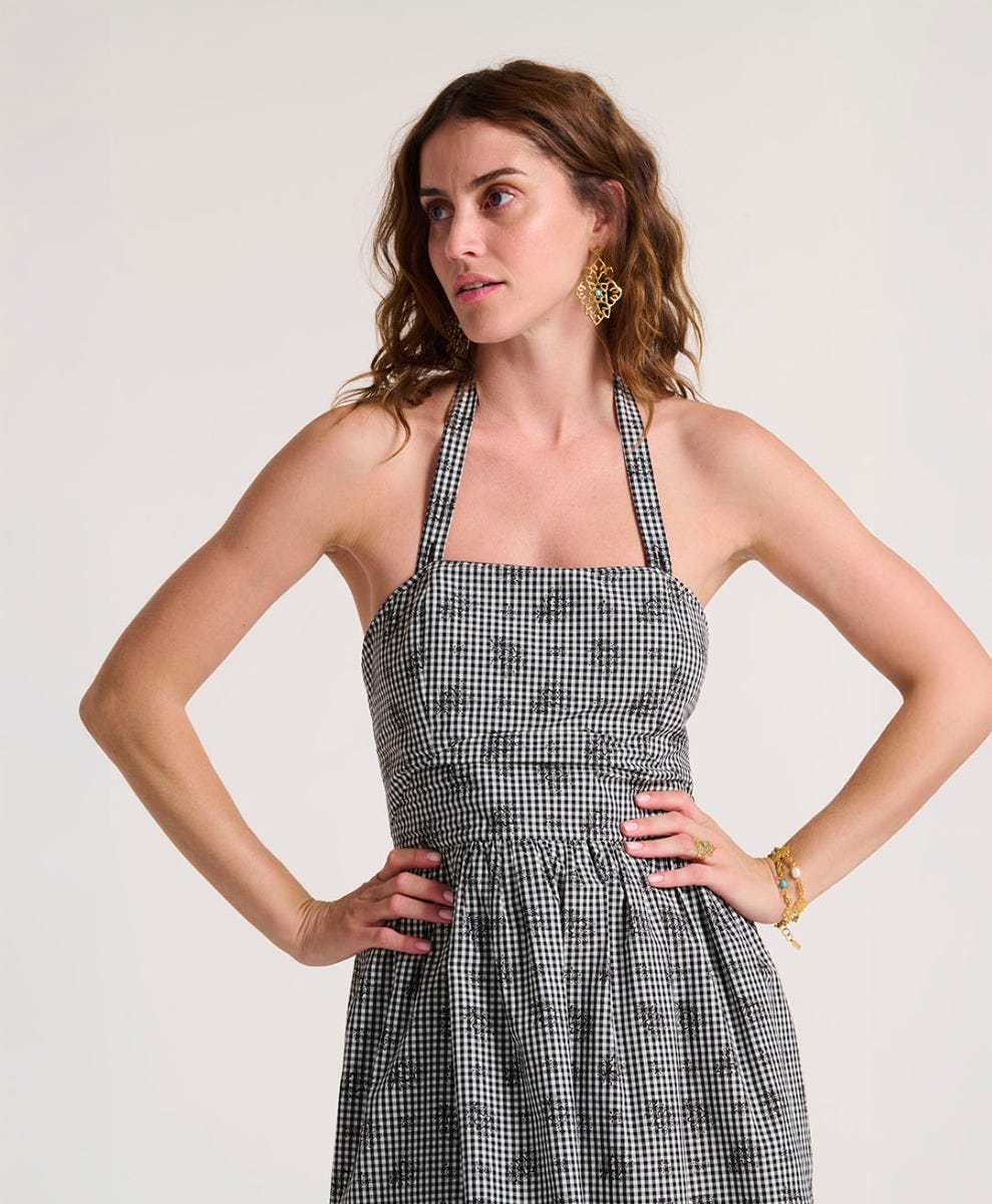 - Dress in gingham jacquard cotton batiste overprinted with our “Ixia” motif in black