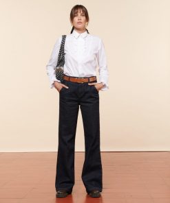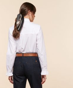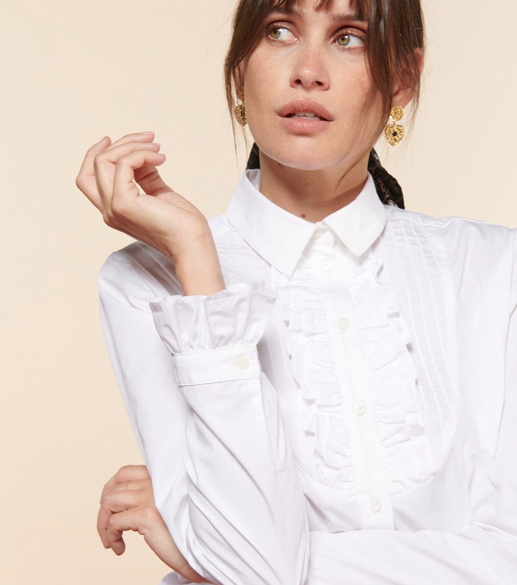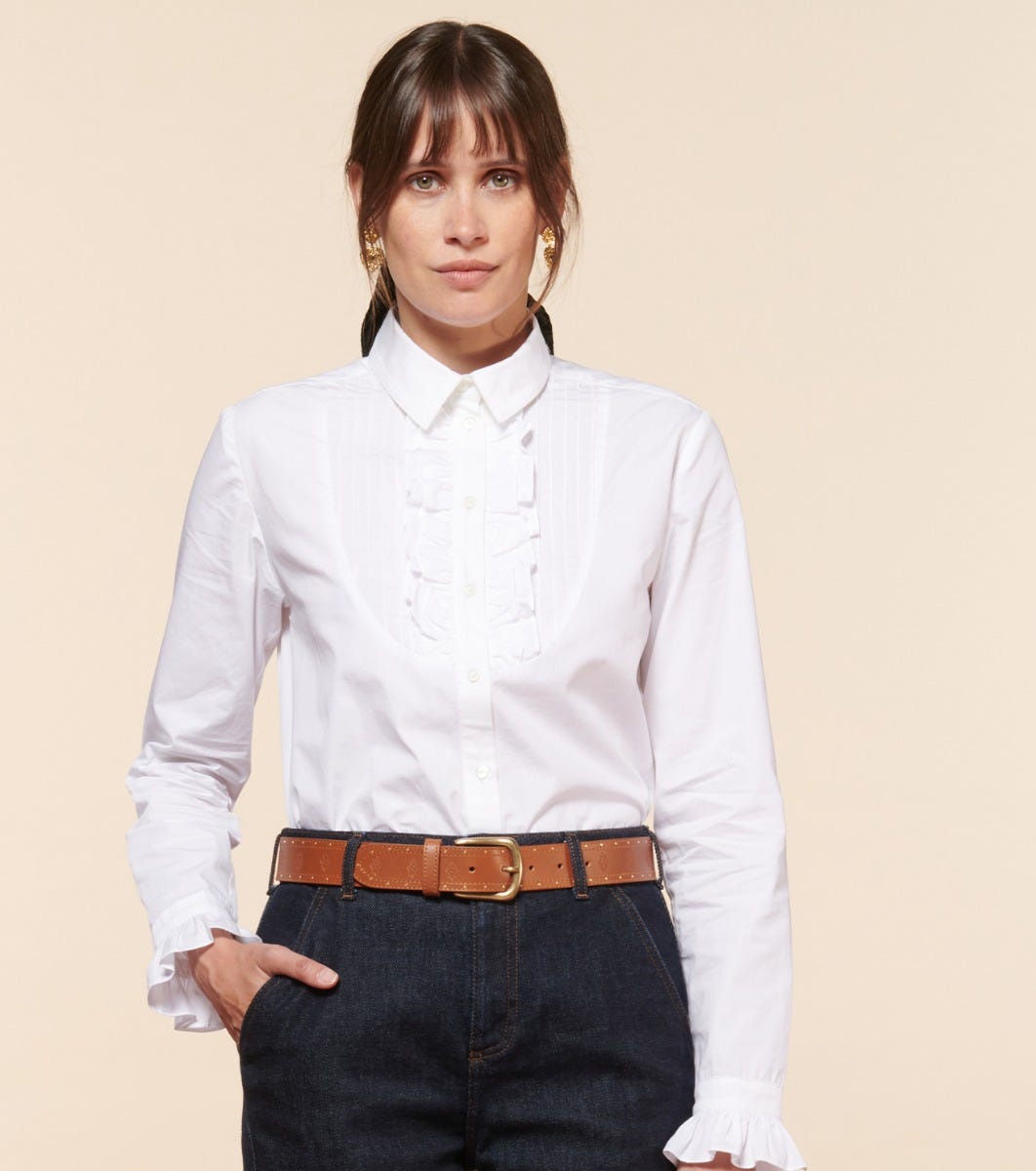 - Frilled shirt with ruffled bib and small pleats, featuring equestrian-inspired details.