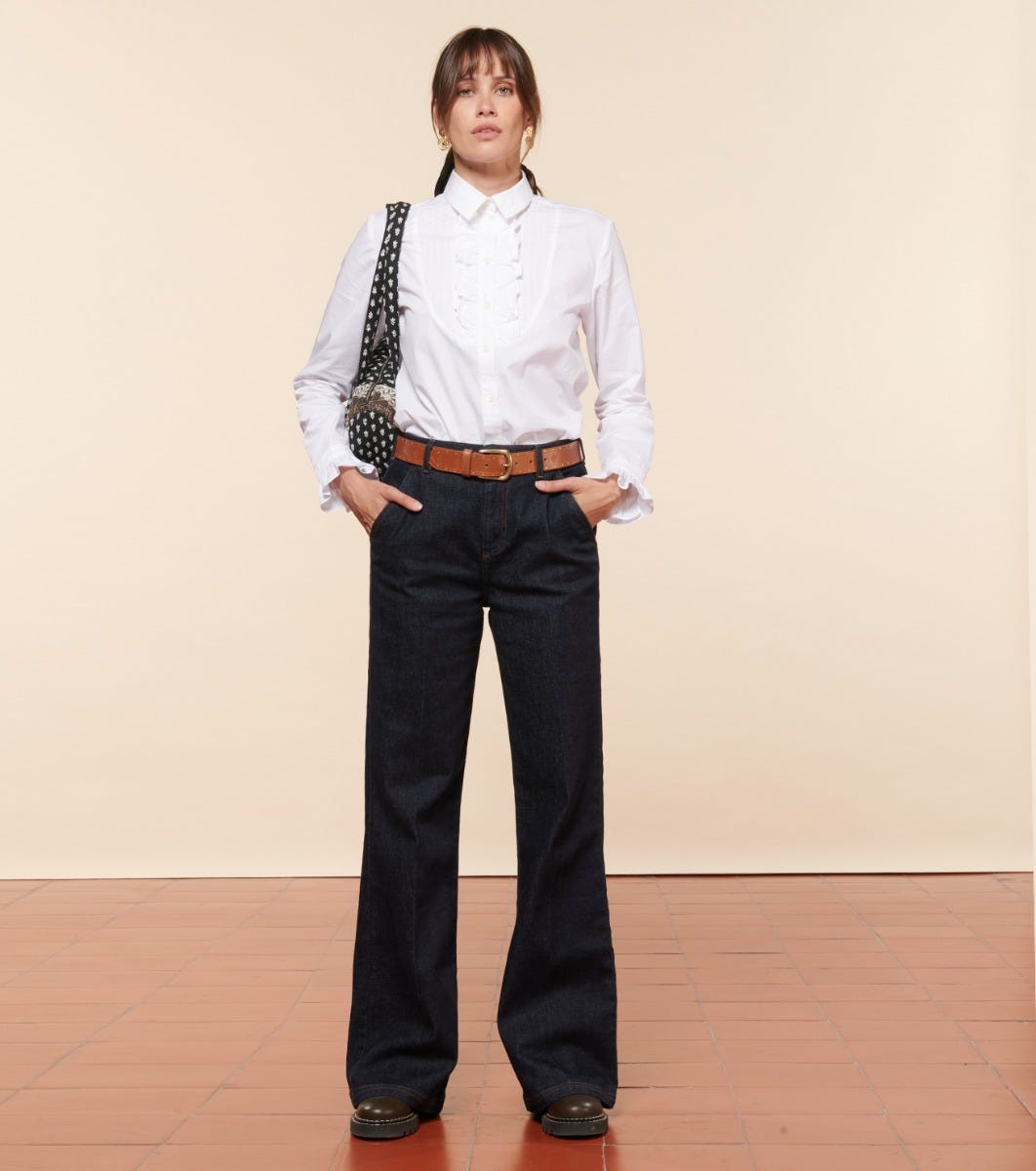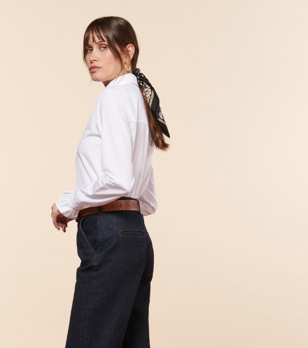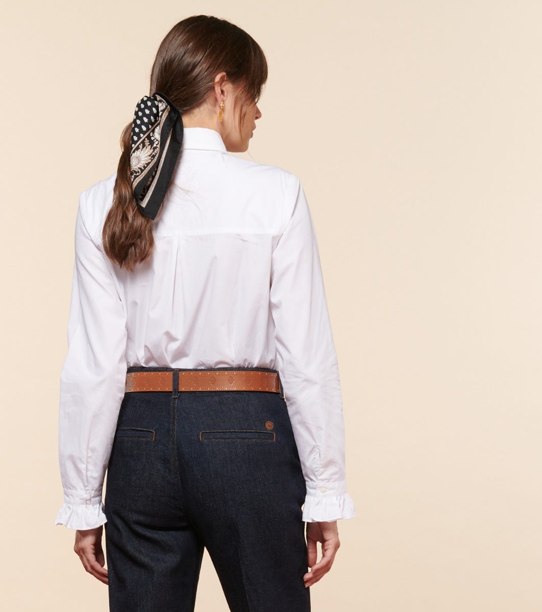 - Long sleeves tightened by a cuff with slit and flounce, closed with button